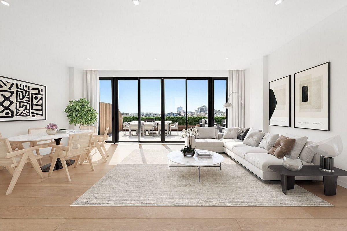 This stunning home features massive floor-to-ceiling windows that let in abundant eastern light in the open-plan living room/dining room which face the terrace with sliding doors, with 7-inch oak floors imported from Spain and soaring 10-foot ceilings.