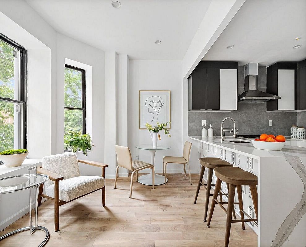 Introducing the top-floor residence at 702 Greene Avenue, set within a classic four-story townhouse with a refined, modern white facade on a quiet, tree-lined block in Stuyvesant-Heights.