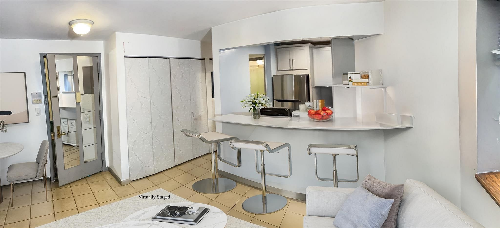 It leads into the kitchen that features high-end stainless steel appliances, including a refrigerator, stove, microwave, and dishwasher, all seamlessly integrated into custom cabinetry. Quartz countertops provide ample workspace and elegance.