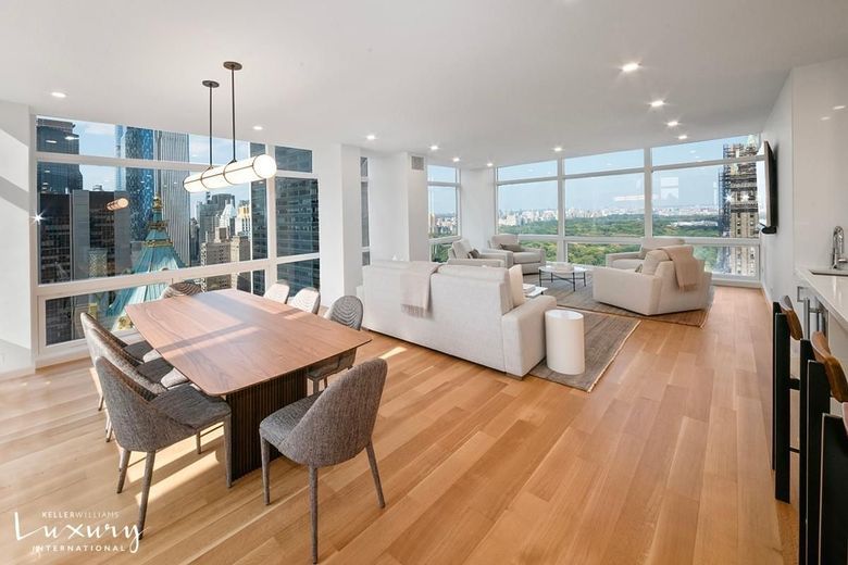 Entering the apartment you move through the elegant, beautifully tiled entry foyer, which holds a discreet and artfully decorated half bathroom and a large closet, and turn into the living area where you are greeted with a truly breathtaking panoramic view of Central Park, the architectural masterpiece which is the top of the former Crown Building (now the Penthouse of the new Aman New York) and the City as it follows Fifth Avenue downtown towards the iconic Empire State Building. Inside this incomparable view is the gloriously open living and entertaining space which has been fluidly divided into multiple seating areas, including a large dining table and chairs. This grand living space extends to the south through magnificent glass pocket doors into a corner den with a full en-suite marble bath and large closet, readily privatized to function as a third bedroom, and also enjoying views of the Empire State Building to the south and the City to the west.