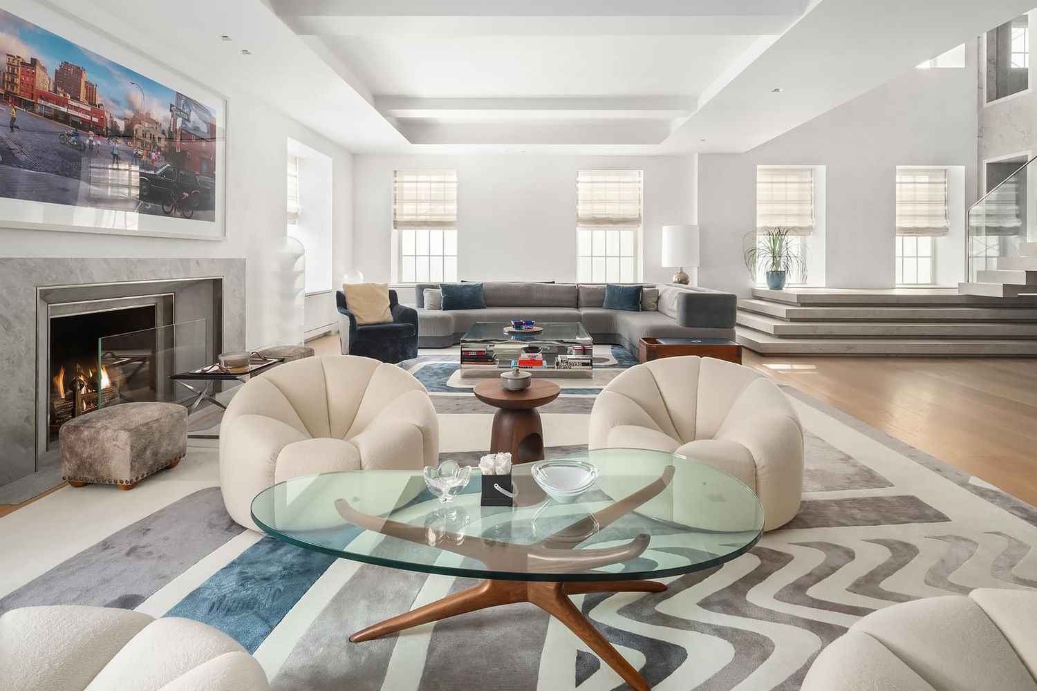 Enter on the 10th floor from a private elevator landing that opens into a glass vestibule which leads to a gorgeous gallery and living room with a wood-burning fireplace and double-height ceilings. An impressive, cantilevered limestone staircase with a floating glass railing is a work of art. It provides a focal point and access to the private quarters on the second level, which can also be accessed via elevator. Beyond the living room is a handsome library clad in ceruse oak with a wood-burning fireplace and wet bar. The sophisticated dining room is in high design with richly detailed finishes including custom-built cabinetry made from quartered white oak and a luxurious velvet banquette. The chef eat-in windowed kitchen was custom designed and built by Arclinea with top-of-the-line appliances including a Wolf 48" 6 burner cooktop and separate grill, dual Gaggenau combi-stem ovens, oversized Miele refrigerator and freezer, 2 Miele dishwashers, floor to ceiling glass cabinetry, and Thermador wine fridge. The kitchen has a separate custom butler's pantry with massive amounts of storage and a large office area which can also be used as an additional staff room.