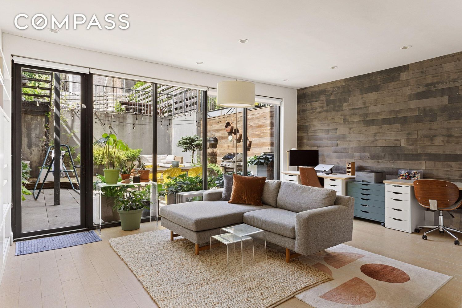 The lower level of this one-of-a-kind residence is ideal for a wide variety of uses, whether a sprawling primary bedroom suite, fitness area, music studio, office, or a combination of all. This wonderful space exits directly to an enormous 20' x 20' garden oasis, the likes of which you wont easily find in Brooklyn. With gorgeous stone pavers, an Ipe wood deck, a water source and room for a large table, seating and planters, this enviable outdoor space is an entertainers dream. This level has a half-bathroom, excellent closets, custom built-in shelving, a full sized washer/dryer and accesses the private storage (included).