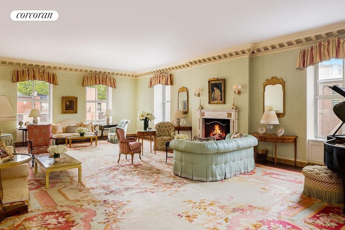 Perfectly situated in Rosario Candela's most coveted building, 740 Park Avenue, this palatial sixteen-into-fourteen-room southwest corner duplex is a true architectural masterpiece. Drenched in sunlight, the residence is distinguished by ceilings soaring to nearly 11 feet, three wood-burning fireplaces, and an extraordinary abundance of beautifully preserved historic detail. The home offers five bedrooms, five full bathrooms, and two powder rooms, along with grand entertaining rooms including a living room, formal dining room, conservatory, library, windowed eat-in kitchen and breakfast room, as well as an oversized staff room and windowed laundry room.