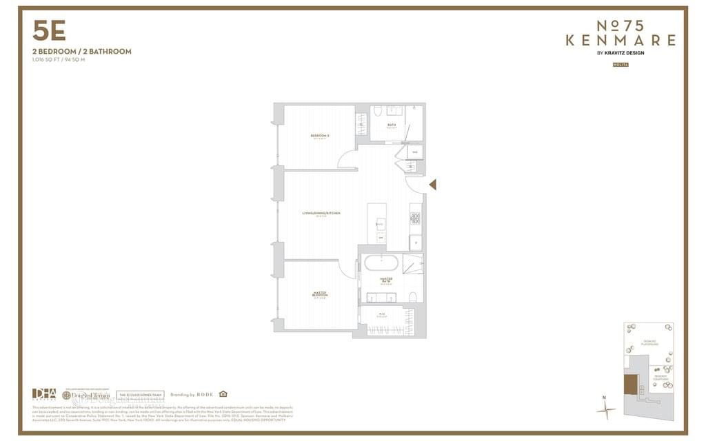 SALES GALLERY & MODEL RESIDENCE LOCATED AT 584 BROADWAY, SUITE 1210This bright and airy split two-bedroom, two-bath corner residence features white oak floors throughout, expansive windows and a concealed laundry closet with washer and dryer. The well-appointed kitchen is outfitted with Gaggenau appliances, a marble island with a custom oak bar top, accented by a rear pewter topped counter, marble backsplash, matte-white cabinetry and an integrated oak paneled refrigerator. The en-suite five fixture master bath is an urban oasis with a freestanding Devon&Devon tub and frameless glass enclosed shower surrounded by French Vanilla marble and titanium Travertine walls and radiant heated floors, a custom floating elm dual vanity with Bianco drama marble countertop and sinks with brushed-nickel fixtures and a dramatic custom backlit satin bronze and nickel framed mirror. The secondary bath with a frameless glass enclosed shower is a sleek retreat finished with honed Pompeii Basalt floors, Bianco Drama marble walls and a custom designed elm vanity, Bianco drama marble countertop and sink accented with satin nickel fixtures and an artfully crafted backlit satin nickel mirror.The curated collection of one to four bedroom residences at 75 Kenmare, born out of the collective vision of Lenny Kravitz's design firm, Kravitz Design, architect Andre Kikoski and developer DHA Capital, introduces the new look of luxury in heart of downtown Manhattan. An array of amenities are offered including a 24-hour attended lobby, landscaped courtyard, rooftop terrace, state-of-the art fitness center and underground automated parking garage. All of this in the heart of NoLita, a uniquely enigmatic and artistically charged neighborhood perched at the intersection of four distinct cultural epicenters ? SoHo, NoHo, the Lower East Side and Little Italy.