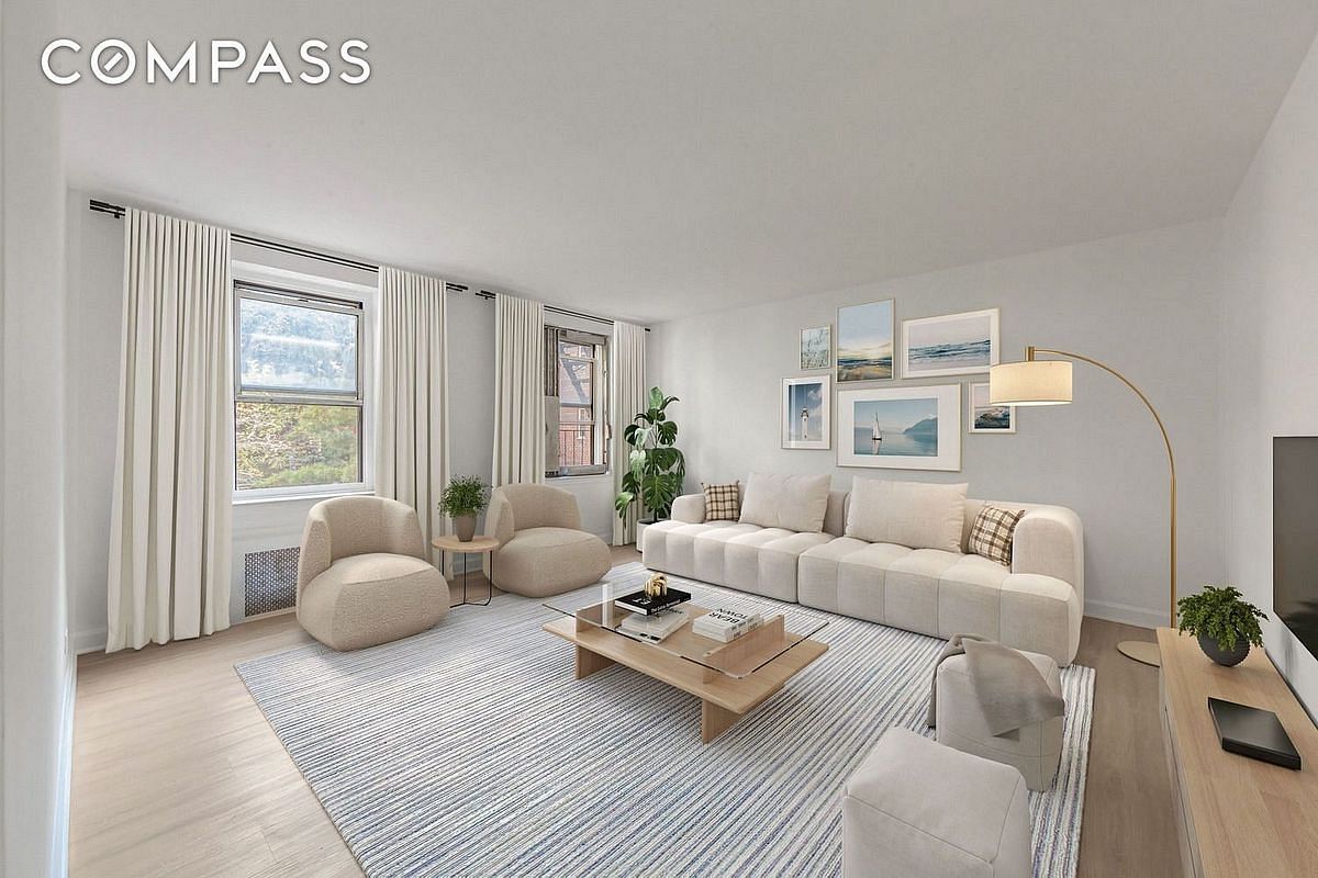 The marble porcelain tiling continues in the bathroom, matching the crisp and clean design of the kitchen. The living room and bedroom are filled with natural light, creating a bright and welcoming atmosphere throughout the day. Large windows frame pleasant courtyard and street views and allow sunlight to stream across the redone floors, enhancing the rooms airy, open feel. The clean white walls and minimalist design provide a perfect blank canvas for any style of dcor, while the generous layout offers flexibility for both comfortable living and entertaining. Perfectly blending warmth and openness, this room sets the tone for a home that feels fresh, modern, and inviting.