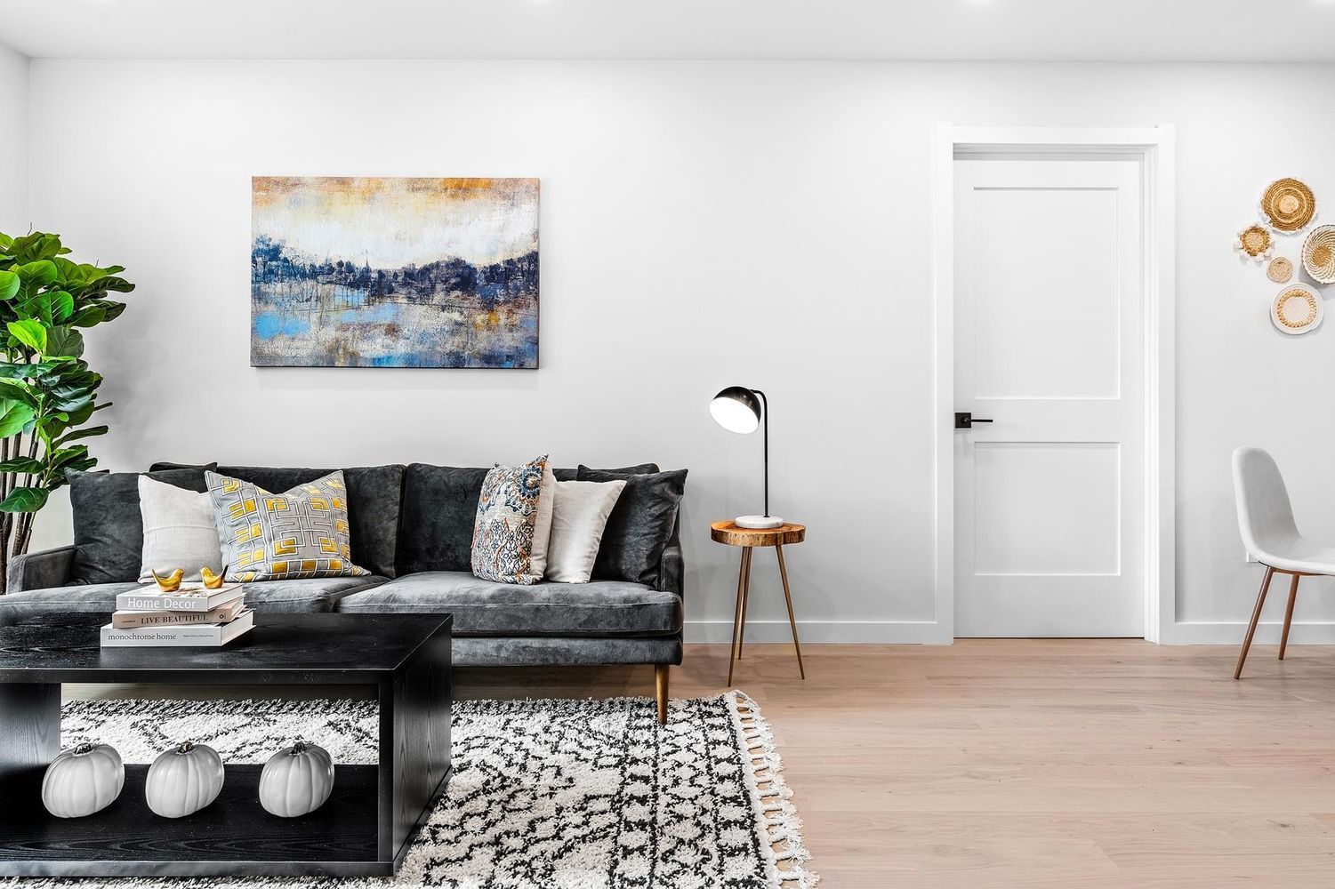 The kitchen is smartly designed with custom cabinetry by Tafisa featuring under cabinet LED lighting. White granite countertops and a continuous slab backsplash add to the sleek modern design. Top-of-the-line appliances include a GE premium 36-inch French door style refrigerator with an internal water dispenser, a 30-inch GE Slide-In Smart gas range with 5 sealed burners, a Fotile dual venting hood with an Intelligent Air Management system and detachable capture shield, and a fully integrated built-in dishwasher by Caf. Spacious bathrooms are outfitted with light gray porcelain tile flooring and wall tile, fully recessed medicine cabinets with LED lighting and defogger functions, and beautiful Kohler fixtures.