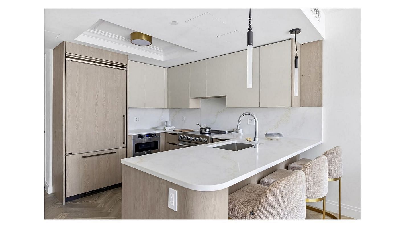 The chef's kitchen features under-cabinet lighting and a best-in-class suite of appliances, including an electric cooktop with Savalo integrated hood, and a built-in Viking and dishwasher.
