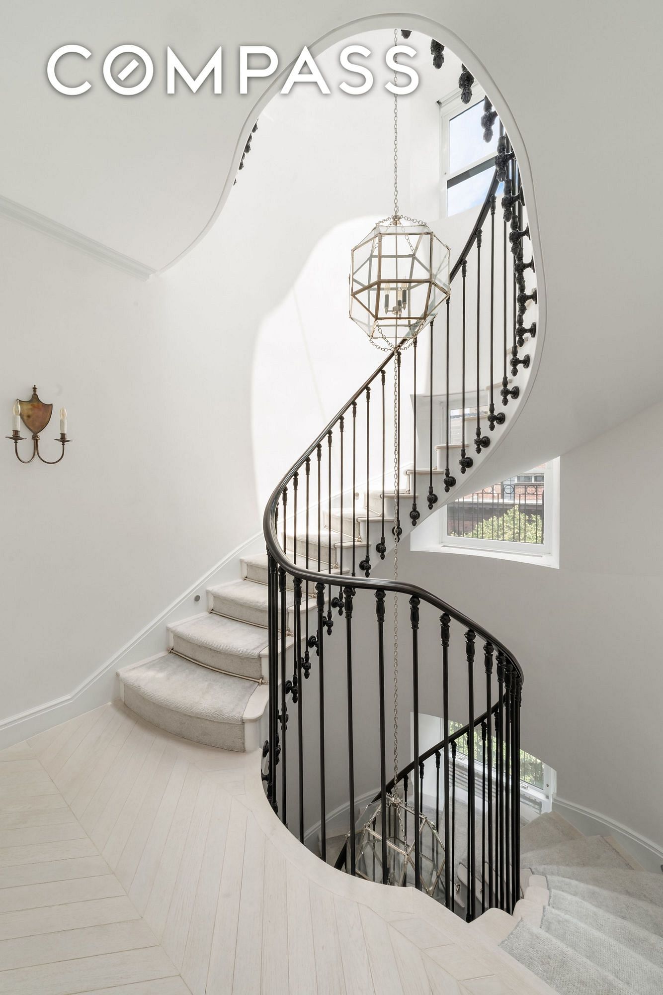 Arrive via private keyed elevator to a full-floor, this 23-foot-wide 2210 square foot entertaining level bathed in natural light. A luminous skylight caps the sculptural staircase, creating a dramatic centerpiece upon entry. The corner great room features a bespoke stone fireplace and custom butlers barideal for refined entertaining. Adjacent, a formal dining room, plush media lounge, and discreet powder room complete the scene. The windowed, eat-in chefs kitchen is outfitted with a custom Lacanche range, a handcrafted Ann-Morris pot rack, and top-tier appliances by Gaggenau, Miele, and Thermador.