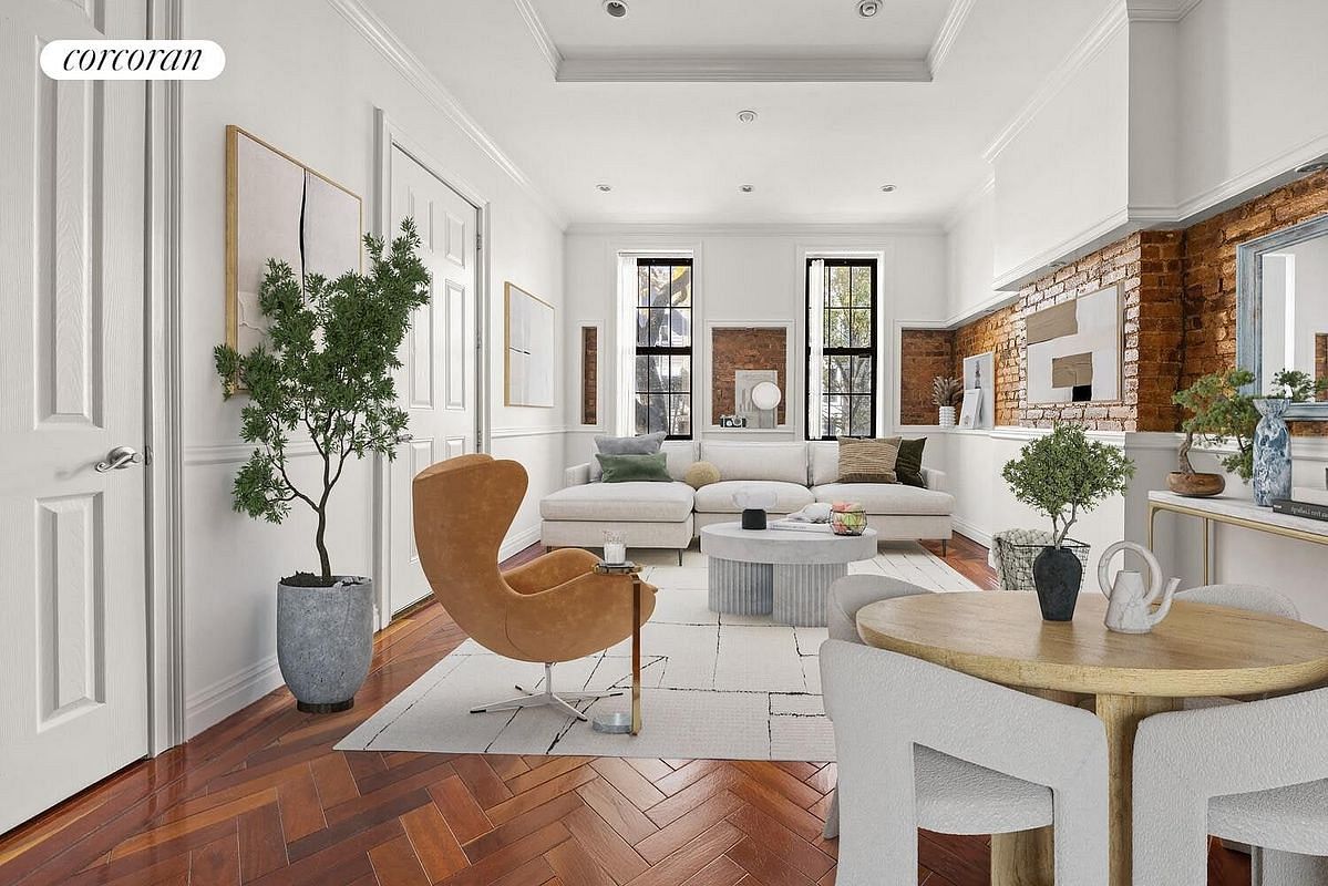 Upstairs you will find residence two. This three-bedroom, two-bathroom apartment is equally renovated. It features a similar layout to the parlor floor, high ceilings, more exposed brick, nicely appointed finishes and ample natural light.
