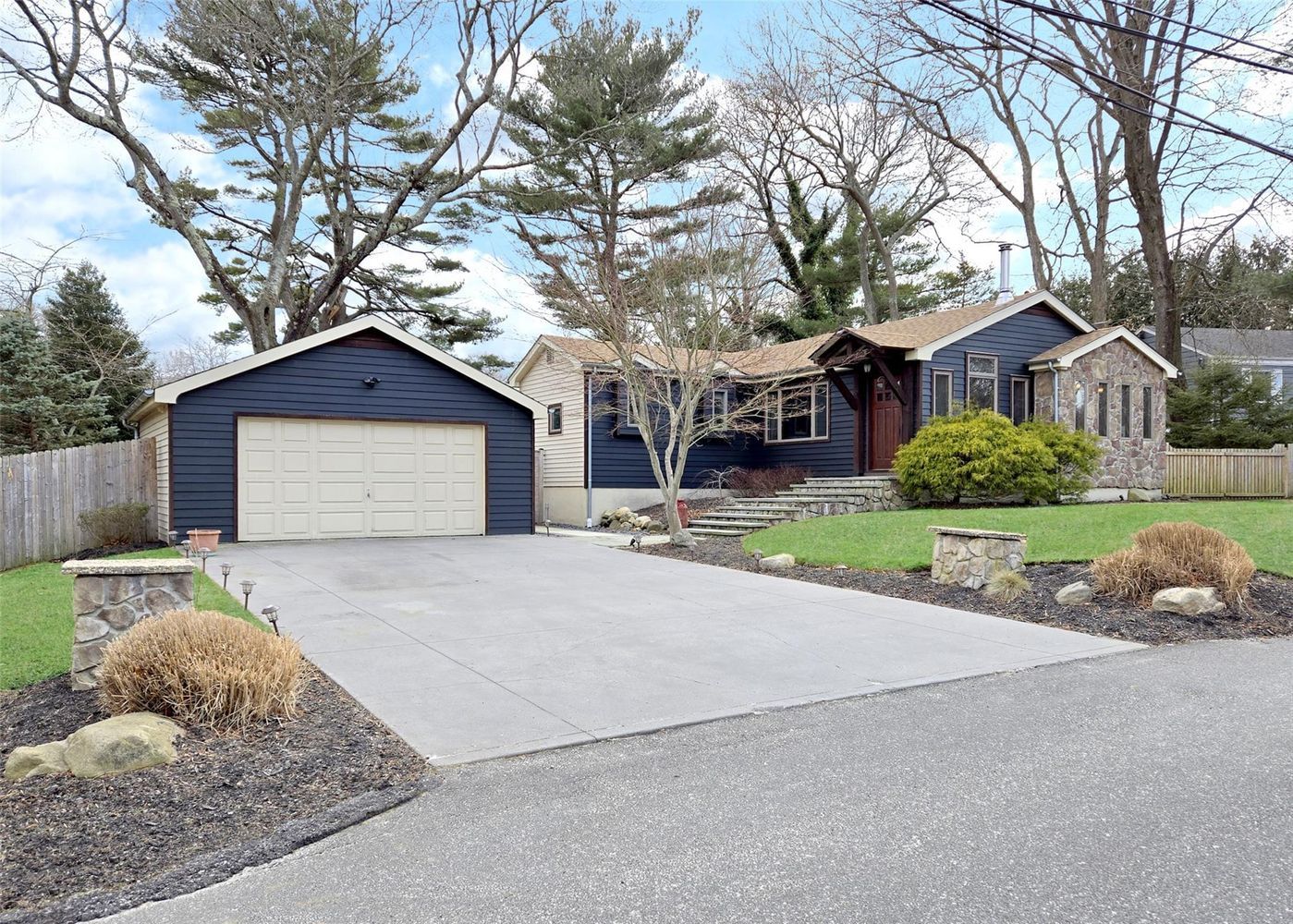 Discover this beautifully renovated ranch in the heart of Lake Grove, where modern elegance meets low taxes! The stunning gourmet kitchen boasts vaulted ceilings, custom cabinetry, chic barn doors, granite countertops, and stainless steel appliances. Unwind in the luxurious primary suite with private patio access and a cozy firepit. Outside, the professionally landscaped, nearly half-acre yard offers the perfect setting for entertaining or peaceful relaxation. This home comes with many premium upgrades, including a new roof, a state-of-the-art air filtration system, central air, a wood pellet stove, surround sound speakers throughout the main level, and custom app-controlled lighting and locks. The full basement, complete with an outside entrance and a French drain, offers endless possibilities for additional living space or storage. Don’t miss this incredible opportunity—make this dream home yours! (square footage is approximate)