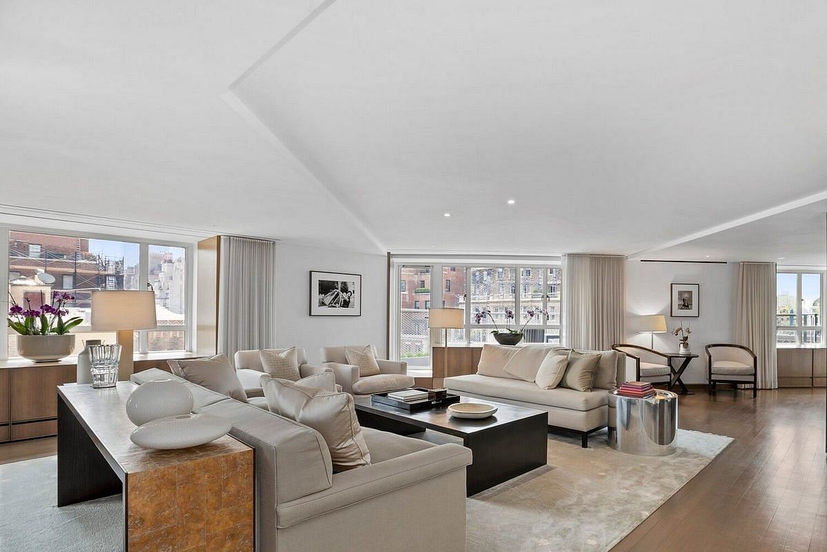An entry foyer with two coat closets and a large Travertine stone powder room welcomes you into an expansive corner double living room with open south and west exposures, and access to a decked terrace with views of Park Avenue and Central Park. There is a large formal dining room, also with access to its own planted terrace, which has an automated irrigation system, and flows seamlessly into a media room and the oversized Boffi chef's kitchen with its spacious breakfast area and a wall of windows with open north exposures. This dream kitchen features top-of-the-line finishes and appliances, including Calacatta marble counters, custom-built lacquered cabinetry, Gaggenau refrigerator, two side-by-side SubZero wine coolers, two Miele dishwashers, Miele double-oven, a six-burner Gaggenau cooktop with ceiling-mounted canopy, and a large walk-in pantry with a second refrigerator, SubZero icemaker and cooling drawers, and abundant storage. Garbage disposal.