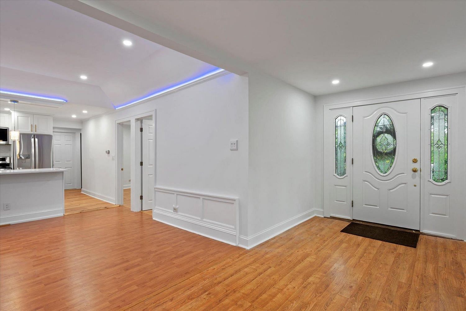 The open-concept layout creates a warm and welcoming atmosphere, perfect for everyday living and entertaining. The brand-new kitchen is a chef’s dream, complete with sleek cabinetry, quartz countertops, stainless steel appliances, a new boiler, a Tank, and a spacious island for casual dining. The kitchen area flows effortlessly into a bright and airy living room with updated recessed lighting and large windows that bathe the space in natural light.