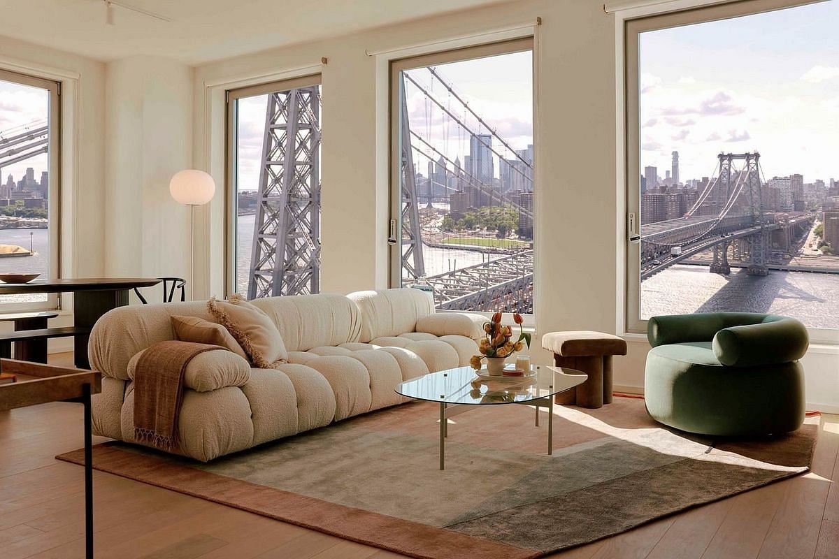 Immediate Occupancy. Introducing One Domino Square, Brooklyn Refined. Annabelle Selldorf designed homes on the Williamsburg Waterfront with over 45,000 Sq Ft of amenities. This stunning southwest corner residence, features two bedrooms, two bathrooms and a powder room. Enjoy natural light and panoramic views of the Manhattan and Brooklyn skylines. The recessed, open-concept chefs kitchen and extra-wide living room layout are perfect for everyday living and entertaining. The primary suite is generously sized and includes custom closets, along with an ensuite bathroom with a luxurious double vanity, a standing shower, and separate 60" soaking tub. Every condominium residence at One Domino Square boasts protected views of the East River that are simply breathtaking. The oversized, sound cancelling, tilt-and-turn windows allow sunlight to wash over wide plank white oak flooring while solar and blackout shades are provided for rest and privacy. 10 foot ceilings give volume to generous room proportions where king size bedrooms are standard. Interiors are thoughtfully considered to the finest detail with custom walnut millwork and lighting in every closet, dimmable overhead lighting in every room, Nest thermostats for every zone, and USB/USB-c outlets at every bedside. Italian kitchens come in two distinct palettes with warm tones featuring teak cabinetry, Carrara marble and oil rubbed butcher block, or cool toned high gloss lacquer paired with Lava Stone waterfall countertops. All homes have a suite of Gaggenau fully integrated appliances including a speed oven and state of the art induction cooktop, as well as vented range hood and wine refrigerator. Ensuite primary bathrooms relax the senses with radiant heated floors and River Stone clad walls. A curbless, glass enclosed shower with infinity drain offers thermostatically controlled hand and rain showers in brushed nickel by Phylrich to enhance the spa-like effect. Final touches include Robern medicine cabinets over double vanities and a power source provided for bidet seat connection. Charm abounds in the powder room where custom wainscoting and select finishes from Annabelle Selldorfs Vica collection are on display. The amenities and services at 1DSQ are unparalleled with over 45,000 Sq Ft of sunlit interiors and terraces across five floors, nearly all of it with unstoppable river views. The open-air indoor pool features lap lanes and seating areas in a verdant spa setting with hot tub, cold plunge, steam room, sauna, treatment rooms and a year-round loggia with views stretching to the Statue of Liberty. A second heated pool, this one outdoors, has resort style seating on a sun deck with loungers, dining areas and outdoor showers. The well-equipped fitness center includes a riverfront yoga studio and high intensity training studio where classes are offered. A third park-like terrace offers intimate al fresco dining niches with grills, outdoor kitchens and views of Midtown Manhattan. A game room, media room, solarium and ample work-from-home space occupy much of the Club Level where condominium owners also have access to waterfront private dining and party rooms. One Domino Square is a new architectural icon on the waterfront with an ethereal porcelain façade, reflecting the ever-changing sky off its pearlescent surface. The design is at the forefront of sustainability and has been built to maximize coastal resilience. The tower stands at the intersection of the world renowned, Domino Park and Domino Square, a one acre plaza featuring ice skating, restaurants, and landscaping by James Corner Field Operations. Two Trees proudly continues to curate incredible retail, dining, and cultural spaces throughout the Domino campus, bringing exciting additions to Williamsburgs thriving scene.