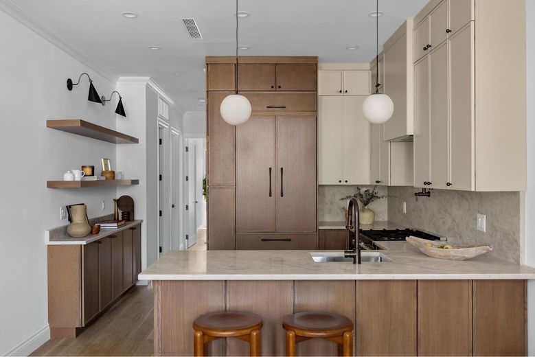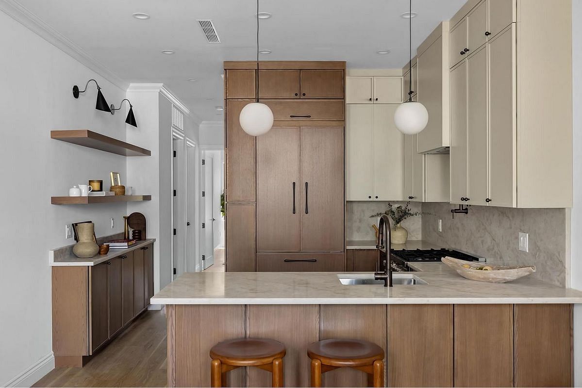 The kitchen is truly the pinnacle of this residence - showcasing rich mahogany tones paired with a lustrous off-white, creating balanced duality. Sleek yet understated, the oil-rubbed bronze hardware adds a timeless touch to the cabinets, seamlessly complementing the kitchen fixtures including a pot-filler. A stunning Taj Mahal quartz was thoughtfully chosen, highlighting its natural veining while beautifully uniting the cabinetry's color palette. An intentionally designed wall of shallow lower cabinetry and floating shelves was added to the far left of the kitchen, offering extra storage while serving as a coffee niche or a display for tasteful decor. This chef's kitchen comes equipped with a Bertazzoni appliance package including a 30" induction range & stove, a paneled vent-hood, 30" double door refrigerator with bottom freezer drawer, and dishwasher.