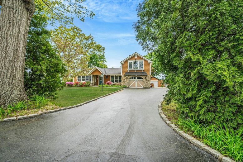 Location, location! Nestled on a quiet street, this stunning 3–4 bedroom, 2.5-bath sun-drenched cedar farm ranch with stone accents offers the perfect blend of charm and modern updates. Beautiful hardwood floors flow throughout, complemented by an updated kitchen featuring a farmhouse sink, porcelain tile flooring, and stainless steel appliances. The home boasts a bright and airy sunroom, living room with stone fireplace, and the spacious first-floor primary suite includes a luxurious, state-of-the-art bathroom. Additional highlights include Andersen windows throughout, recessed lighting, central air conditioning, six skylights, built in book shelves, custom moldings and paint, French doors 200-amp electric panel, and two 275-gallon oil tanks. The partially finished basement includes a cozy den with an outside entrance. Enjoy outdoor living with a 2.5-car garage, bluestone walkways and patio, and a cobblestone-lined driveway—all set on a .35 professionally landscaped yard with beautiful gardens. This exceptional home won't last!