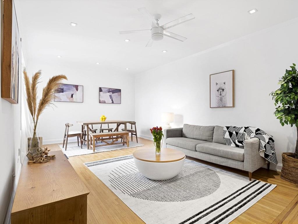 Themodern kitchen is a chef's delight, featuring quartz countertops, reclaimed wood open shelves, ample storage, high-end appliances,including aBoschdishwasher and refrigerator, and a Jenn-Air range. Theoversized, north-facing living roomis perfect for relaxing and entertaining, with tall ceilings, good light, and dining space.