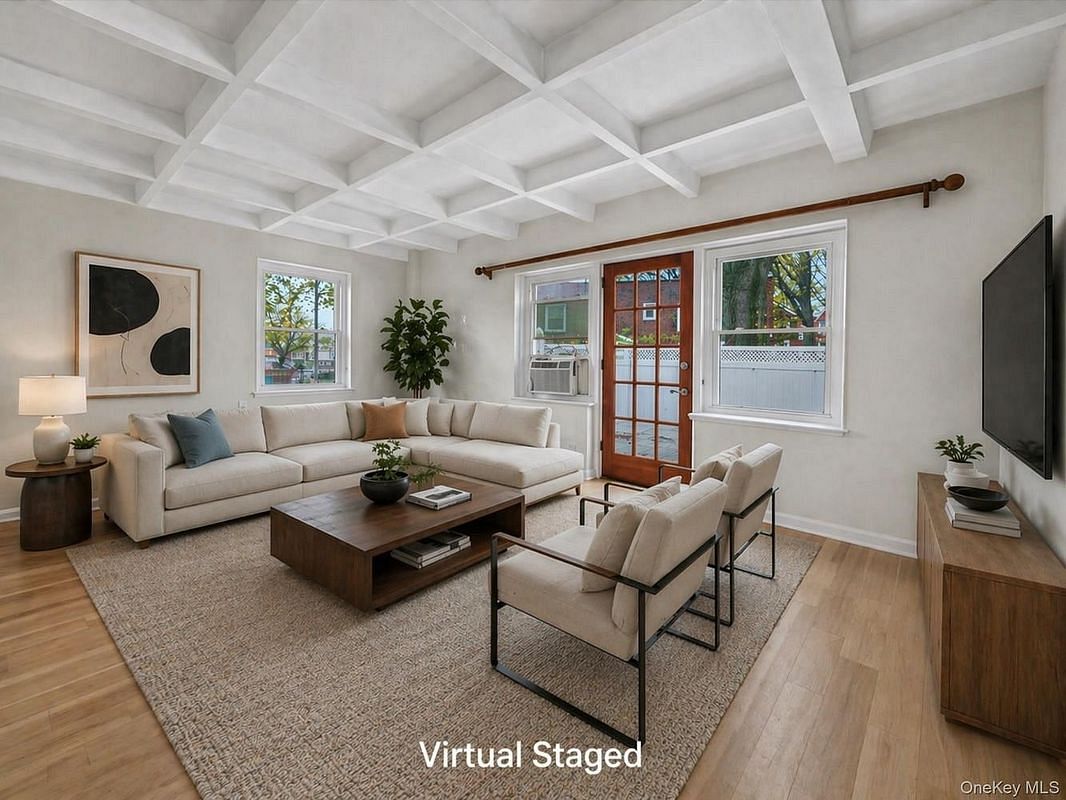 Welcome to 82-86 Parsons Blvd #110A, a two-bedroom duplex located in the Parkway Village community in Briarwood. Recently refreshed, the apartment features new hardwood flooring on the first level, refinished hardwood floors on the upper level, and fresh paint throughout. The main living and dining area offers coffered ceilings and strong natural light.