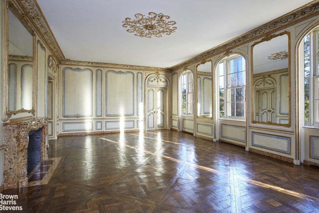 A private elevator landing opens onto an impressive and stately 45-foot gallery with Parquet de Versailles floors and a wood-burning fireplace. The gallery provides access to all of the entertainment rooms of the home. The grand drawing room, formal dining room and inviting library, all have Parquet de Versailles floors, soaring 12-foot ceilings, extraordinary Louis the XV and XVI marble mantles and outstanding Boiseries that were carefully curated from important private homes in Europe.