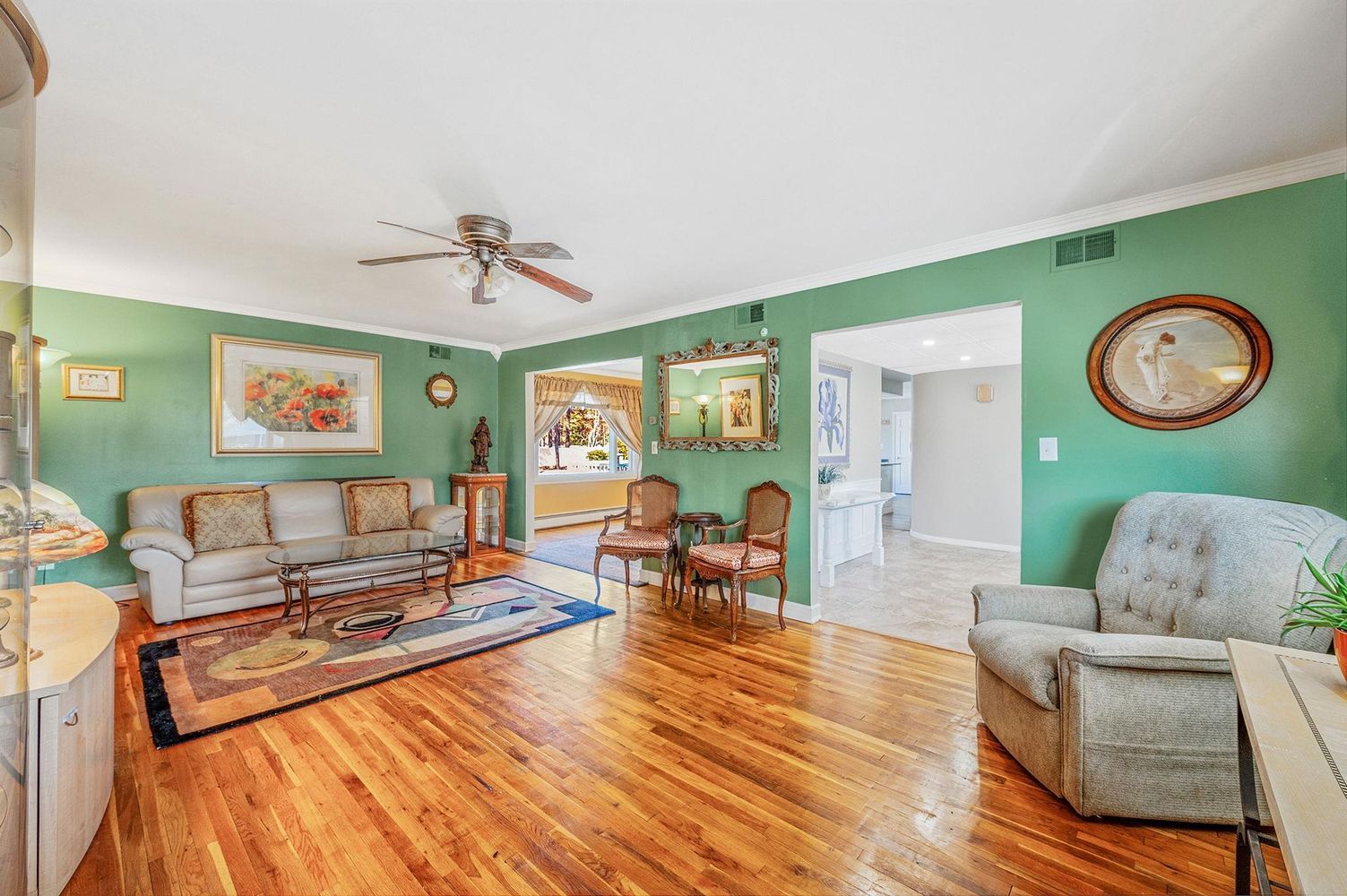 Upstairs, enjoy an oversized primary ensuite bedroom with front and back exposures and a walk-in closet. The finished basement offers additional living space and includes a new oil burner. Central A/C throughout, supplemented by ductless units in each of the four upstairs bedrooms and two additional ductless units downstairs providing versatile cooling options.