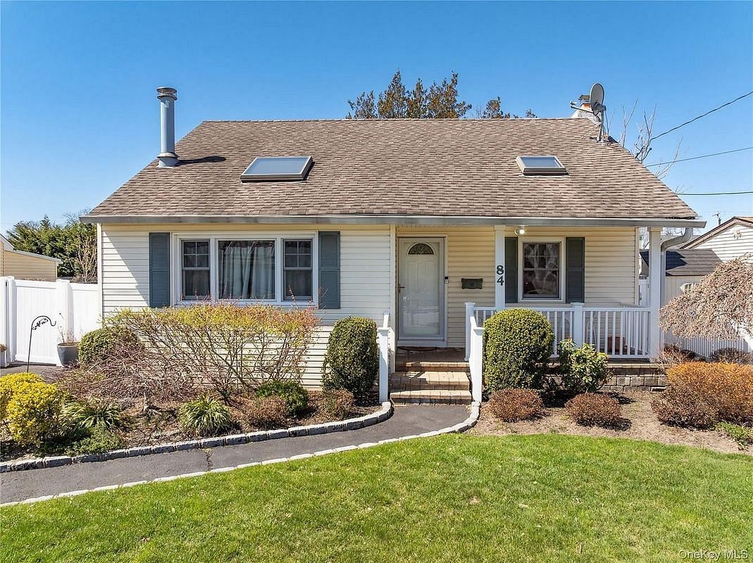 Welcome to 84 Rhoda Ave North Babylon! This home features 3 bedrooms and 1 1/2 baths! The kitchen is spacious featuring wood flooring, cream cabinetry, white appliances, and a tiled backsplash. A living area featuring hardwood floors, fireplace with a tiled surround and mantelpiece, built-in shelving, and a skylight. The primary bedroom is on the first floor with the 2 other bedrooms upstairs. This home also has central air conditioning and was fully converted to gas! The basement is huge and ready for your finishing touches. Solar panels on the rear of the house to save on those rising energy costs! A wonderful deck and spacious well- maintained yard to finish out the wonderful charm of this home!