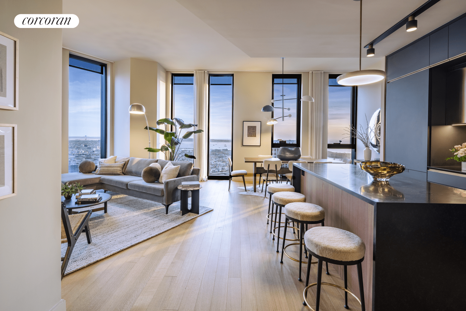 Designed by award-winning SHoP Architects, residence 56F is a generously proportioned 1,930 SF southwest-facing three-bedroom, three-and-a-half-bathroom home with ceiling heights up to 11 feet. Expansive floor to ceiling windows let in an abundance of natural light, framing sweeping views over Brooklyn, all the way to the Atlantic Ocean.