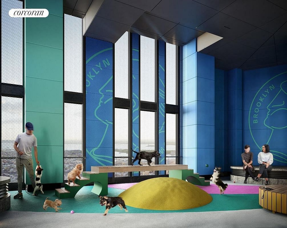 Residents at Brooklyn Tower have access to one of the largest residential amenity offerings in New York. A world-class performance-infused lifestyle, secured with over 100,000 square feet of exclusive indoor and outdoor leisure spaces. Life Time Athletic Club will manage an impressive array of amenities including a 75' outdoor lap pool and whirlpool, fully-serviced poolside lounge and atrium, billiards room, library lounge, conference room, theater with wet bar, and co-working lounge. Dedicated private resident amenities include a children's playroom, limited off-site parking, and the coveted Sky Park, boasting an open-air loggia featuring a basketball court, foosball, playground, and dog run.