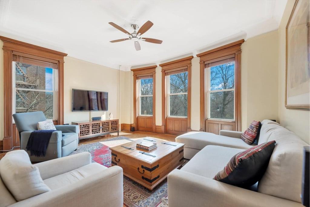 86 Prospect Park West, 3R is a stunning Central Slope 3-bedroom / 2-bath corner apartment on one of the most prized blocks of Prospect Park West. Three large living room windows have postcard views of Prospect Park, directly framing the landmark Litchfield Villa. Eleven more windows looking over beautiful tree-lined and quiet 4th Street and the rear fa ade provide abundant natural light throughout the apartment.The apartment, in a quintessentially Park Slope Beaux Arts building (built in 1909), features original, unpainted woodwork; elegant, working pocket doors; unaltered period dining room built-ins; and classic, original parquet floors throughout. The spacious entry hall welcomes you with its museum-quality original plasterwork. The spacious corner living room feels even larger with the expanse of park and 4th Street just outside its windows and is large enough for entertaining or simply for movie or game nights.From either the living room or foyer, you access the first bedroom, currently a full-time home office, through pocket doors, with built-ins providing ample storage. Along the hallway, you come to the large primary bedroom, which can easily accommodate a king-sized bed. The primary bedroom has an ensuite bath with deep-soaking jacuzzi tub, and a wall of closets (closets throughout the apartment are outfitted with California Closet shelving). The third bedroom is also generously sized with built-in closets and overhead storage and more beautiful tree-filtered light.The dining room features stunning original woodwork and a wall of fully preserved display cabinets, with leaded glass doors. The natural light creates a bright and cheery space for entertaining.Finally, you come to the ingeniously-designed kitchen which teems with practical storage - from pull-out pantry shelving, to ceiling-height cabinetry. The kitchen is perfect for cooking, eating at the breakfast bar and, from a built-in desk area, working at home. Appliances include a fully vented large oven, and dishwasher, and full-sized washer and gas dryer. A second full bath with shower and natural light and ventilation is tucked away next to the laundry and utility closet.The apartment includes a large designated basement storage area, which can be easily accessed either through a courtyard or from Prospect Park West. The basement has an additional laundry facility for extra-large loads. 86 Prospect Park West is a self-managed, pet friendly co-op building.