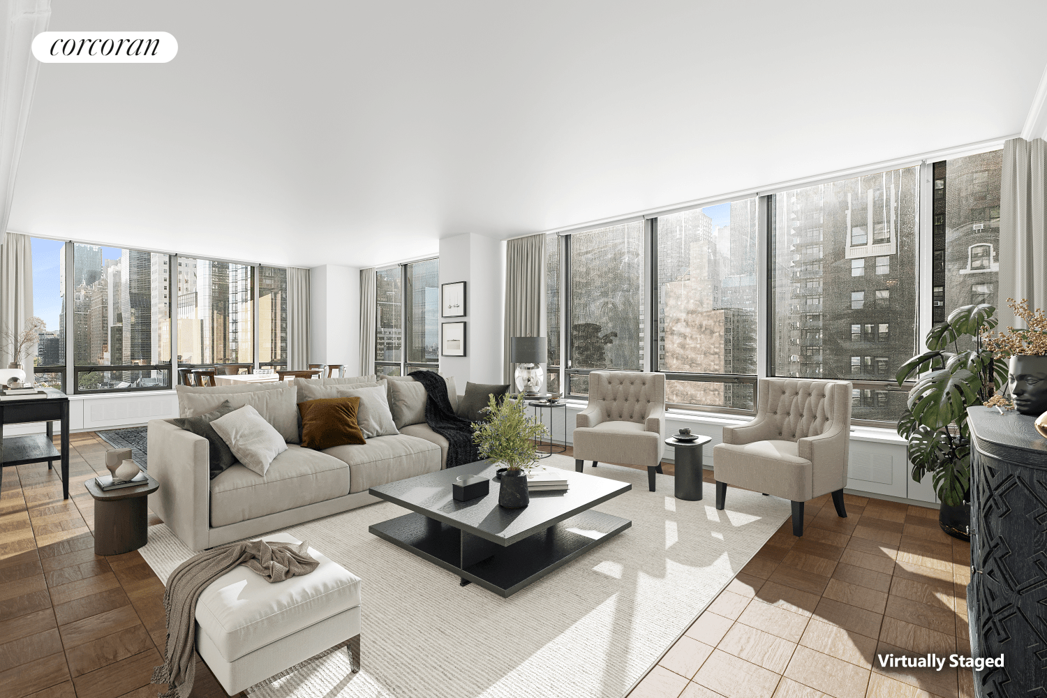 Perched high above the city in one of Manhattan's most prestigious cooperatives, this sun-flooded corner home offers a commanding vantage point through oversized windows with sweeping Southern and Eastern exposures. The graciously scaled layout opens with a dramatic foyer that flows into an expansive living room - an entertainer's dream - where sky, city, and water merge into an unforgettable backdrop.