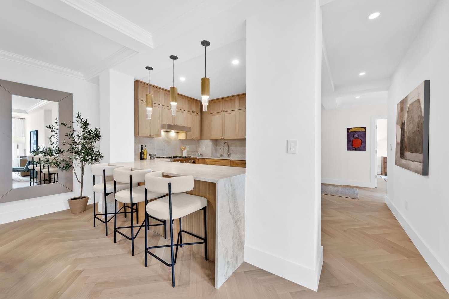 From the moment you step inside, you're greeted by soaring ceilings and beautifully laid white oak herringbone flooring, the expansive living and dining areas offer ample space for gatherings. The gourmet kitchen is a chef's dream, outfitted with custom millwork, ample pantry space and high-end appliances including a Bluestar range, Wolf microwave oven, Miele French door fridge and Miele dishwasher. All kitchen and bathroom fixtures are by Kohler, blending classic design with trusted performance. Also included is an in-unit washer & dryer.