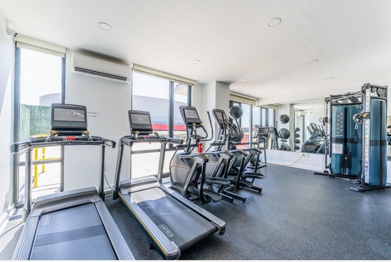 24-hour doorman, elevator, fitness center, rooftop terrace, bike storage, and parking garage.
