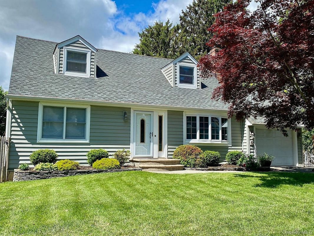 Welcome to this beautifully updated dormered Cape, tucked away on a cul-de-sac and offering an inviting entry foyer with hardwood floors. The home has been freshly painted, showcases crown molding and detailed woodwork and Andersen windows throughout. The kitchen features granite countertops, a new convection oven, and opens to a formal dining room. The main level includes two bedrooms and an updated full bath with radiant floor heating (2023). The dormered second floor offers two well appointed bedrooms, each with two closets including a walk-in and an updated full bath (2022). The finished basement expands your living space with a spacious den featuring a wood burning fireplace, wet bar, LED hi-hats, and built in speaker wiring perfect for entertaining. A laundry room, half bath, and a versatile bonus area provide flexible options for a home office, fitness room, or media space. Additional highlights include 3 zone oil baseboard heating, 2 zone central air, an attached garage with electric opener, and in ground sprinklers in both the front and backyard. Outside in the peaceful, fully fenced yard with mature perennials is a covered patio ideal for enjoying the outdoors rain or shine. Located in the desirable Triangle section of Melville, between Schneider's Farm, White Post Farm, and St. Anthony's School, this home truly offers the best of both worlds: a tranquil backyard retreat and a convenient location close to everything you need.