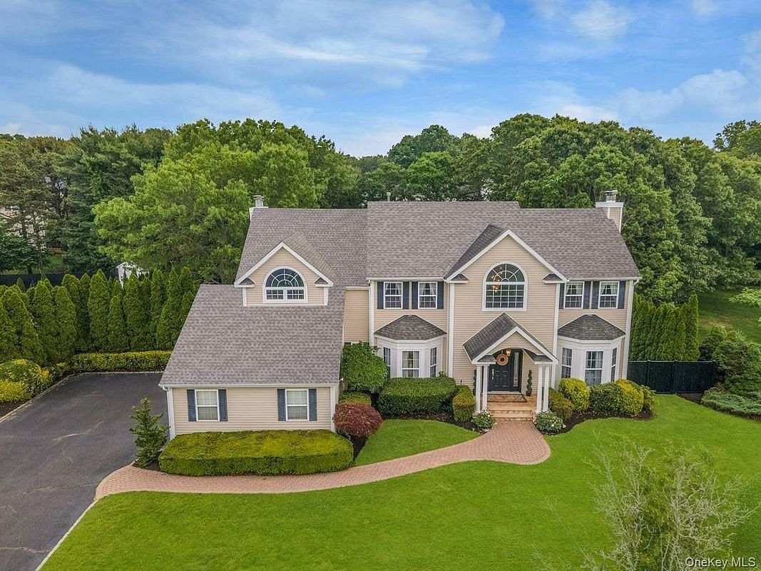 An extraordinary opportunity in the highly sought-after Three Village Club in East Setauket, this exceptional five-bedroom, four-full-bath, and one-half-bath colonial is ideally positioned in the heart of the community and offers a seamless blend of luxury, scale, and resort-style living. From the moment you arrive, the expanded blacktop driveway with cobblestone border, custom brick walkway, stone front porch, and inviting portico create a striking first impression, leading into a grand two-story entry with a wrought iron staircase, hardwood floors, custom moldings, crown detailing, recessed lighting, and soaring ceilings. The expansive layout is designed for both everyday living and entertaining, featuring a sun-filled formal living room with a wood-burning fireplace and custom mantle that flows into a true chef's kitchen. This standout space includes black cabinetry, white quartz countertops, a bold black-and-white backsplash, glass display cabinets, wine storage, and a large two-level island with pendant lighting, along with premium Thermador double oven, built-in microwave, and oversized Built-in refrigerator. This massive kitchen features two eat-in areas, one with French doors. An additional eat-in area opens directly to a full deck overlooking the backyard. The kitchen connects seamlessly to a formal dining room with hardwood floors, natural light, and designer wallpaper, while a private sunken den and home office, enclosed with French doors, offers a quiet and refined workspace complete with coffered ceilings, custom built-ins, gas fireplace, and surround sound. A well-appointed mudroom with washer and dryer, built-in cabinetry, and side entrance access, along with a finished powder room with wainscoting, completes the main level.