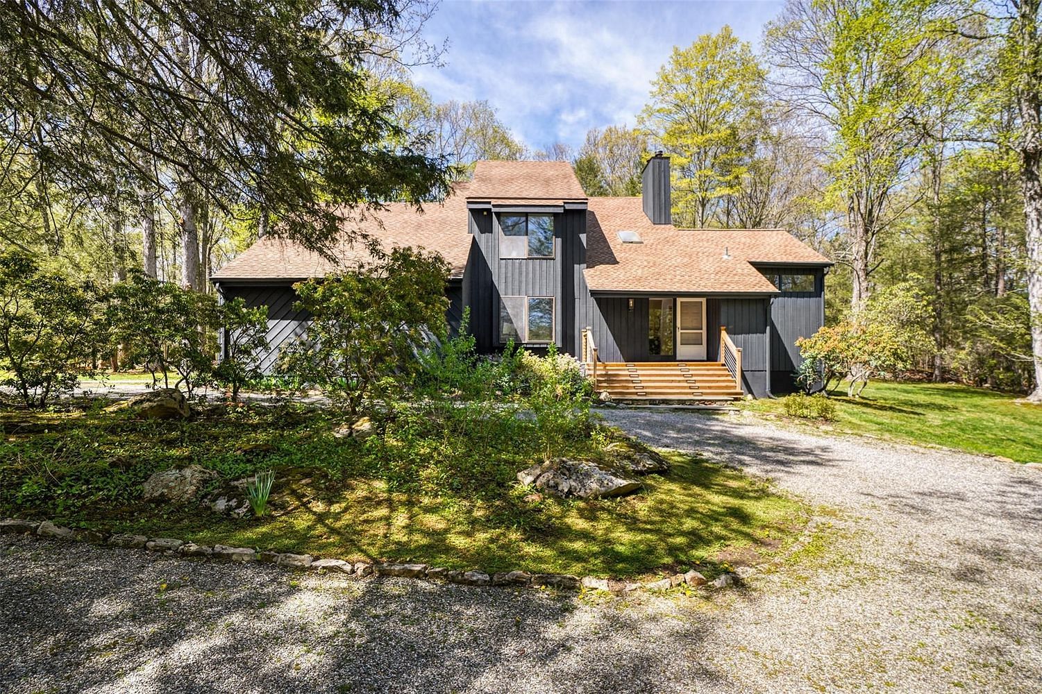 Peaceful and Private. Striking Country Contemporary set high on a hill. Open and airy interior with easy open floorplan perfect for today’s lifestyle. Skylit two-story Entry. Dramatic Living Room with soaring ceiling, and stone fireplace. Great Room with fireplace and open-concept Dining Area. Doors to deck and Screened Porch for easy outdoor entertaining. Jaw-dropping new Kitchen with custom cabinetry, natural Quartzite counters, a large working center island and high-end Thermador appliances. Privately situated Office for working remotely. Four beautifully scaled Bedrooms including a spacious Primary Suite. Lower Level Recreation Room. Two beautifully landscaped acres with towering evergreens, stone walls, flowering Rhododendrons and level lawns. Easy access to Scotts Corners, the Town Park and Halle Ravine. Fabulous!