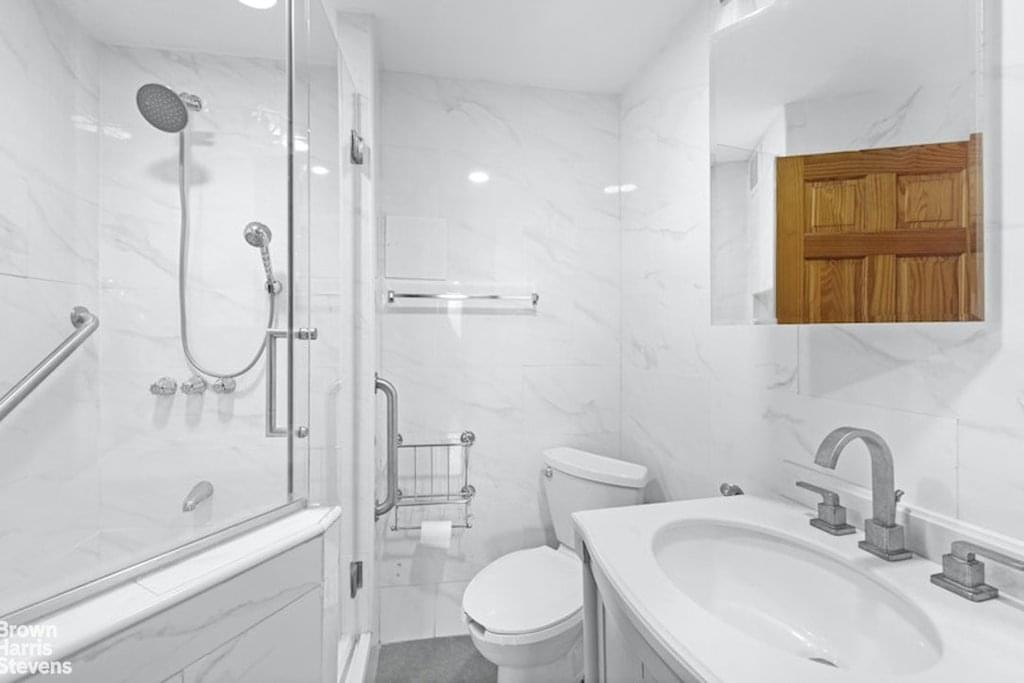 The gut-renovated kitchen features composite stone countertops and stainless steel appliances. The bathroom was also fully renovated and features a uniquely efficient layout.