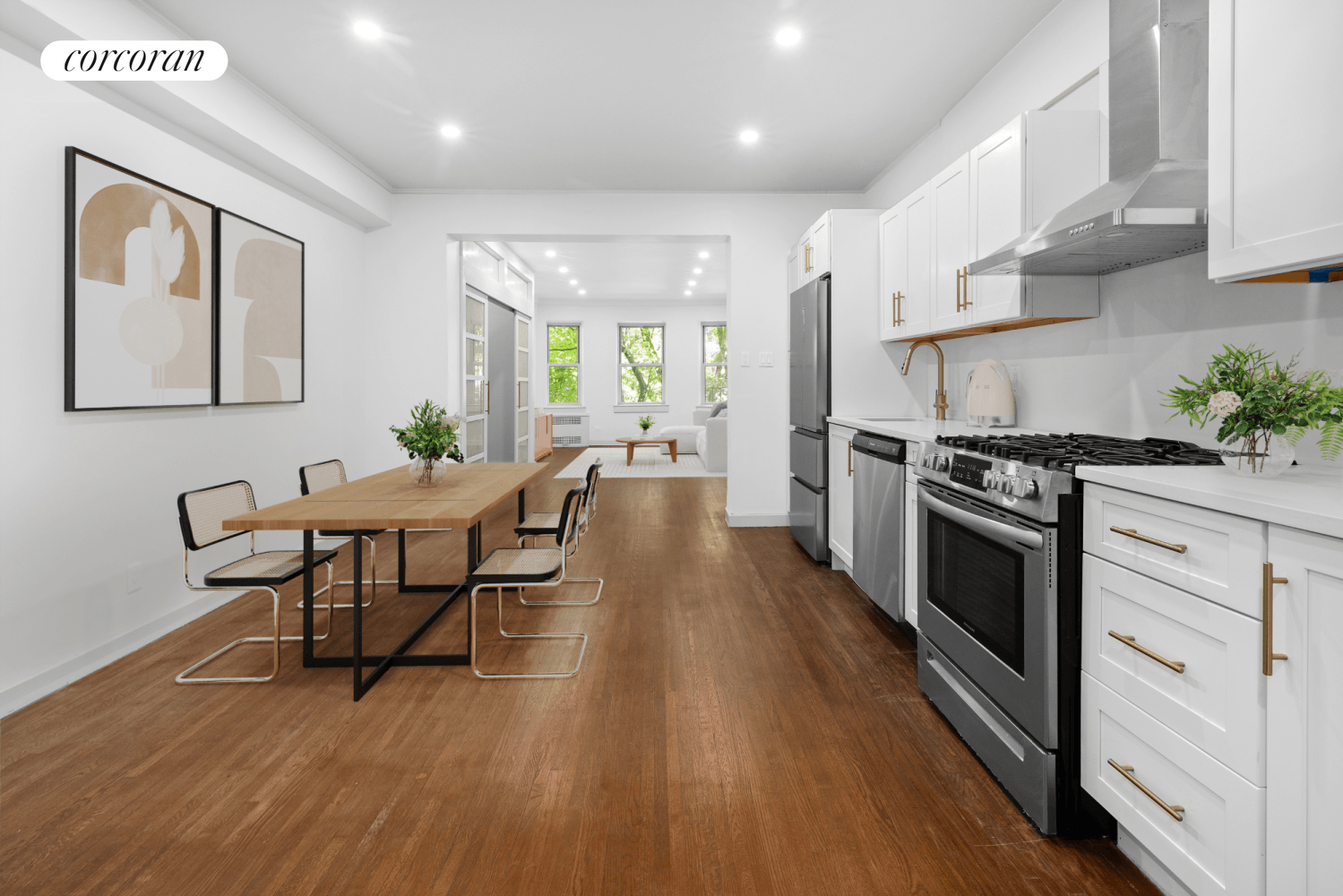 The generous layout spans over 600 sq ft, and begins with a proper entry foyer and two large closets. One coat closet and the second a larger than life walk-in pantry. From there, you're welcomed into a bright, open kitchen, fully renovated with white cabinetry, quartz countertops, brass hardware, and a full suite of stainless steel appliances-including a French door fridge, gas range, dishwasher, and vented hood. There's more storage and counter space here than you'll find in many one-bedrooms.
