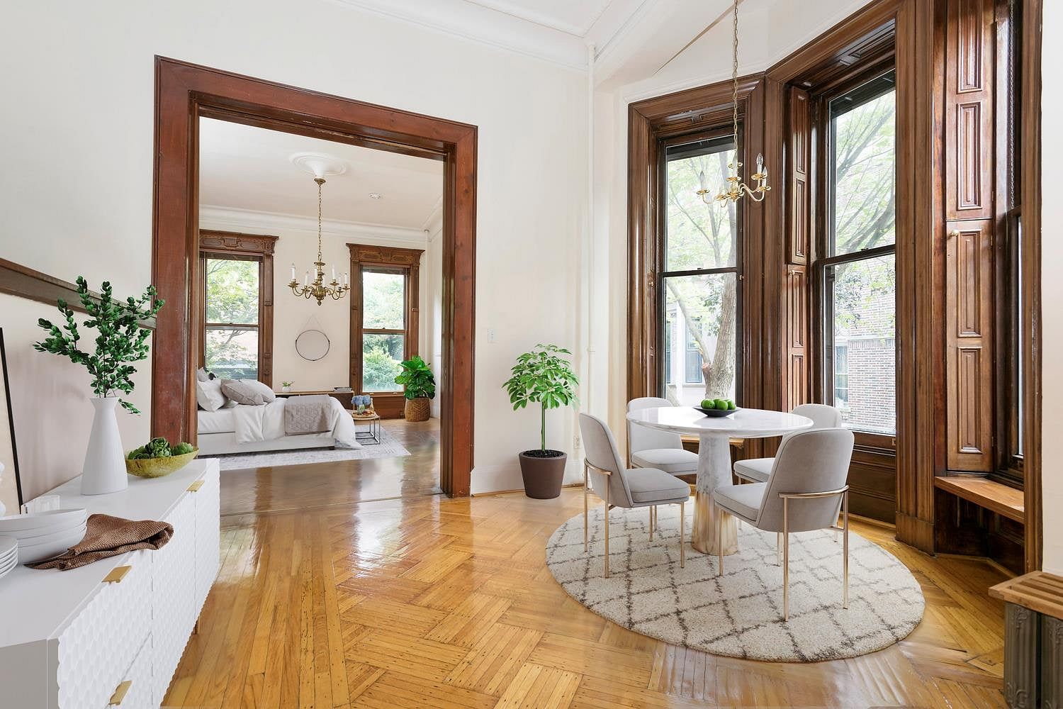 This grand home is an impressive 23.5ft in width and 60ft in depth on a 100ft. deep lot with an expansive canvas of 8,460 sq. ft. including the cellar. The garden level is accessed through the private side stoop entrance and is configured as a one bedroom and one and a half bathrooms and features details including pocket doors, bay windows, mantle and access to spacious private yard oasis. This unit has an interior staircase making it easily combined with the parlor floor and also has direct access to a well-maintained multi-purpose cellar. At the top of the stoop is the entrance to four additional sun-soaked dwellings each with in unit laundry starting with parlor floor featuring 12'3" ceilings, a stunning bay window dining area and mantles. The second floor has two bedrooms, an oversized living room and a fabulous eat-in kitchen with a bay window overlooking President St. The third and fourth floors each have generous living rooms perfect for entertaining and large primary bedrooms as well as a windowed pass through which can serve as an additional bedroom, den or office.