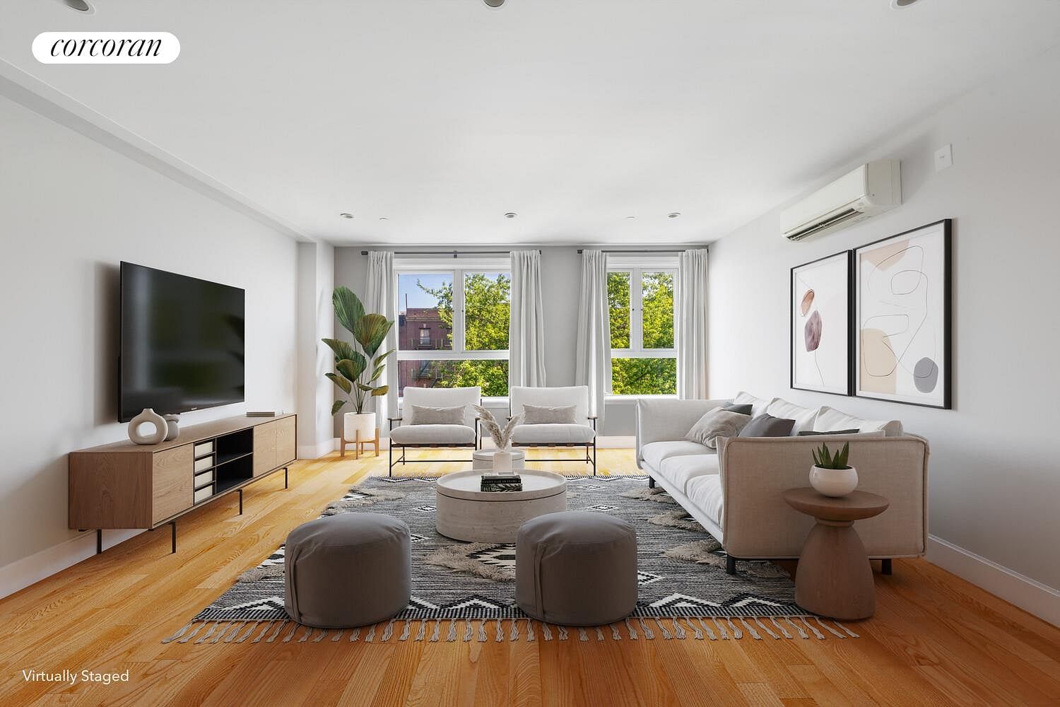 Tucked away on a quiet, tree-lined block in the heart of Clinton Hill, this thoughtfully designed duplex condo offers over 1,200 square feet of indoor living space and a private outdoor escape and a dedicated cellar storage unit. Perched on the top floor of a boutique building, this 2-bedroom, 2-bathroom floor-through home combines rustic, warm aesthetic with a refined modern touch.