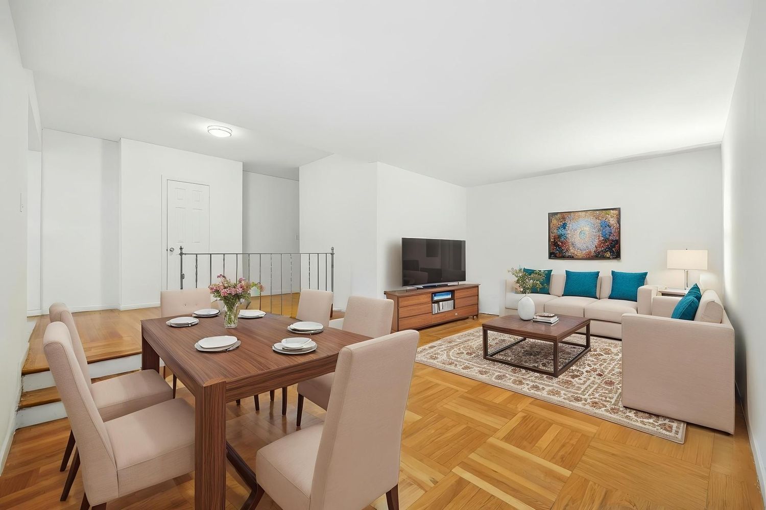 The large sunken living room is ideal for entertaining and dining, while the generous entry foyer can double as an office or separate dining section. The windowed eat-in kitchen features granite countertops, stainless steel appliances, full-size dishwasher, and built-in microwave with venting.