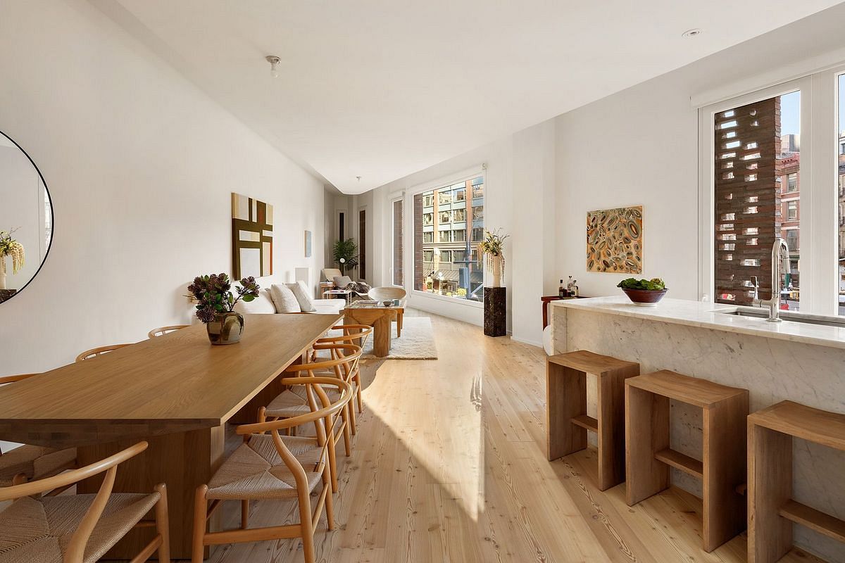 HVAC, custom larch hardwood flooring throughout, a W/D and high ceilings complete this lovely home. This architecturally unique property has unrivaled light throughout and windows that frame the Tribeca cityscape beautifully.