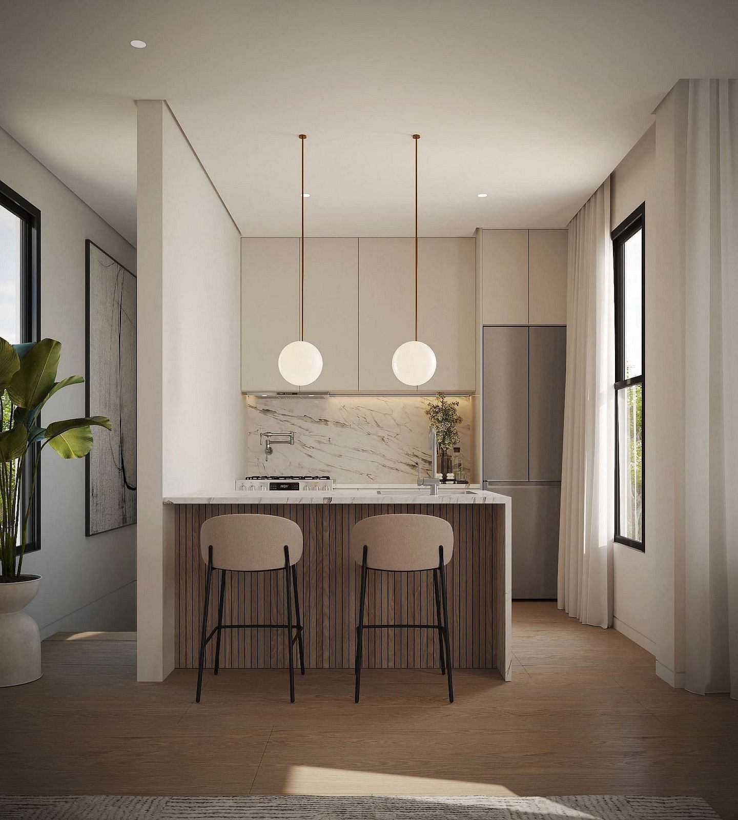 The open living and dining area flows seamlessly into a sleek kitchen outfitted with custom cabinetry, stone countertops, stainless steel appliances, and refined detailing designed for both everyday living and entertaining. The space is filled with natural light, airy, and beautifully balanced.