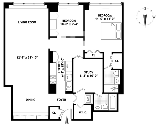 This generous apartment offers livable, flexible space at a very attractive price point. Thirty-three foot southern living room with room for separate dining and library with functional built-in cabinetry. A smart layout includes two bedrooms, the master with en-suite bath, each facing south receive all-day sun and are wonderfully quiet thanks to double insulated, noise-proof windows. Large eat-in kitchen with dining area and abundant storage. This spacious apartment also features a separate den or home office with its own newly renovated full bath that provides very useful extra space. This desirable apartment features solid plaster walls, hardwood floors, city-windows throughout, through-wall air conditioning, and even its own washer/dryer.