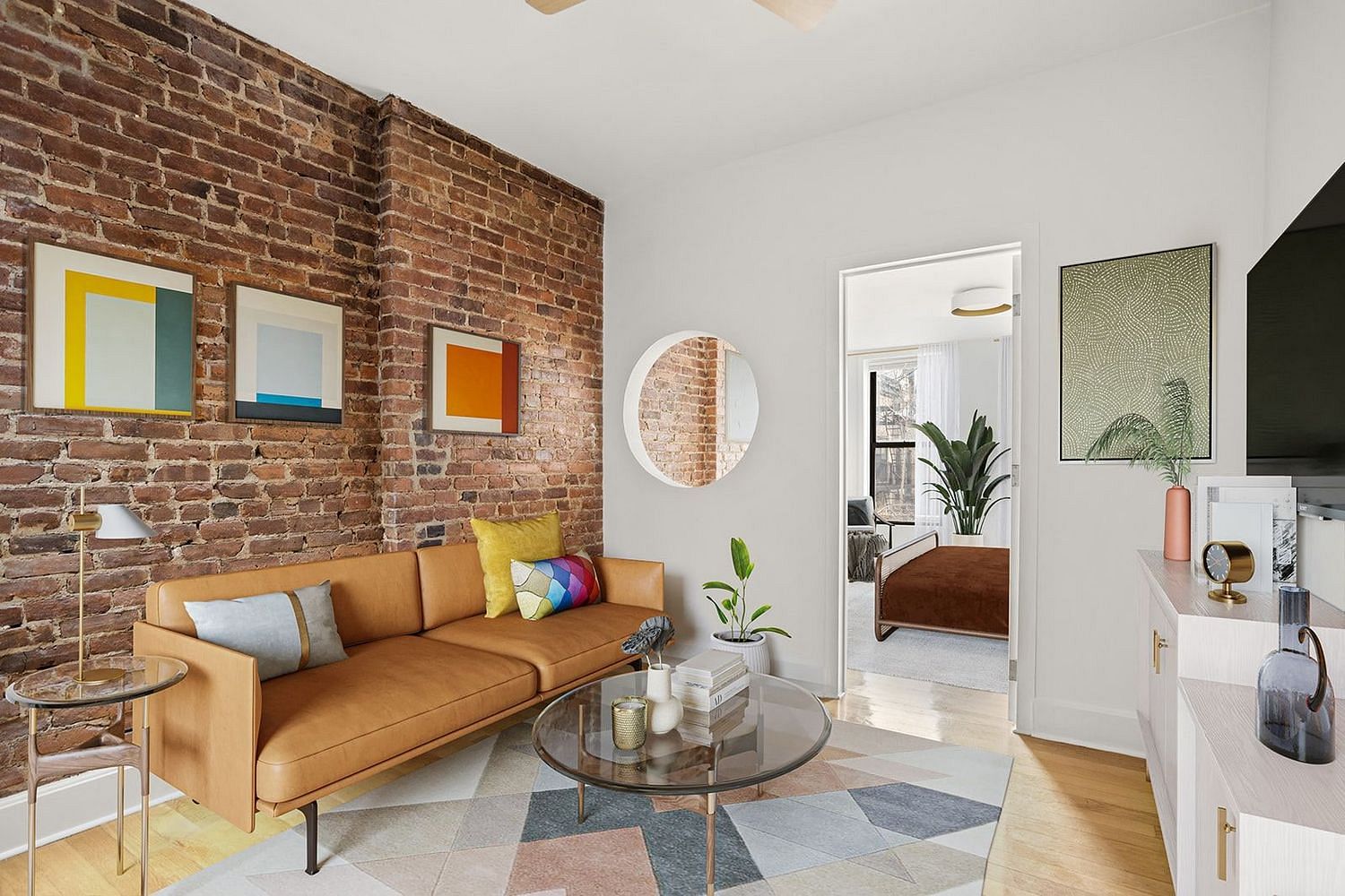 The bedroom is bright and sunny with exposed brick and a decorative fireplace.
