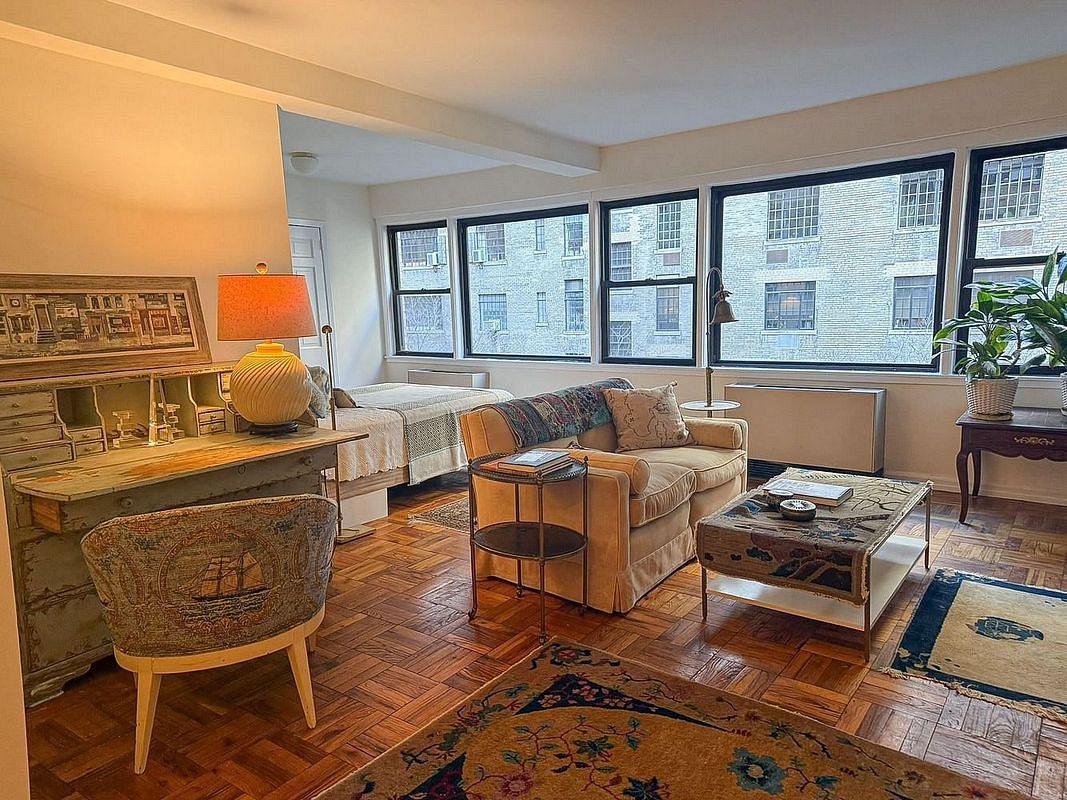 This bright, north-facing, oversized alcove studio features an expansive wall of windows overlooking serene gardens in a pin-drop quiet setting. The flexible layout allows for easy conversion to a one-bedroom. Parquet floors run throughout, complemented by distinctive black-and-white tile in the entry foyer and kitchen. The apartment includes an updated, generously sized bathroom with a full bath, along with an electric oven and cooktop. A wonderful opportunity to customize and make it your own.