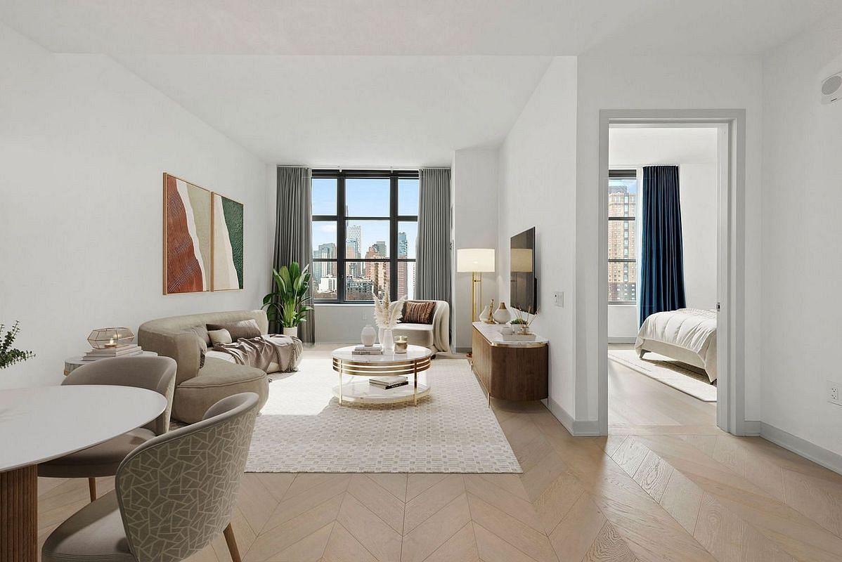Residence 12H is a 740sf light-filled one bedroom residence offering a generously proportioned layout with three closets and immense divided light windows that frame expansive southern views toward the Downtown Brooklyn skyline.