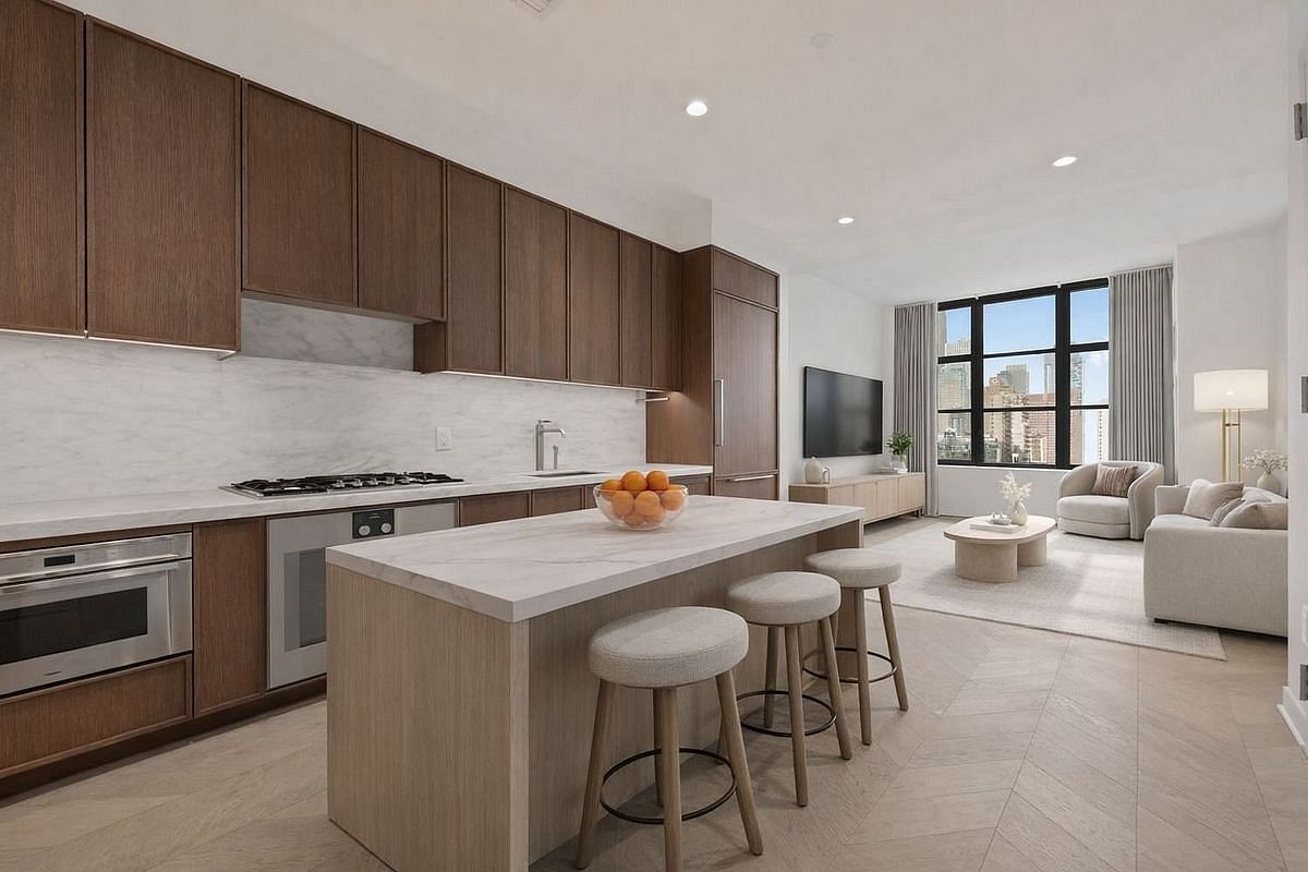 The custom designed chef’s kitchen is equipped with a large pantry and a full suite of state-of-the-art Gaggenau appliances adding luster to the custom Morris Adjmi designed white oak cabinetry and hand-selected Calacatta Caldia marble counter tops and back splash. Elegant and refined interiors are graced with approximately 10’ ceilings and chevron-patterned white oak flooring.