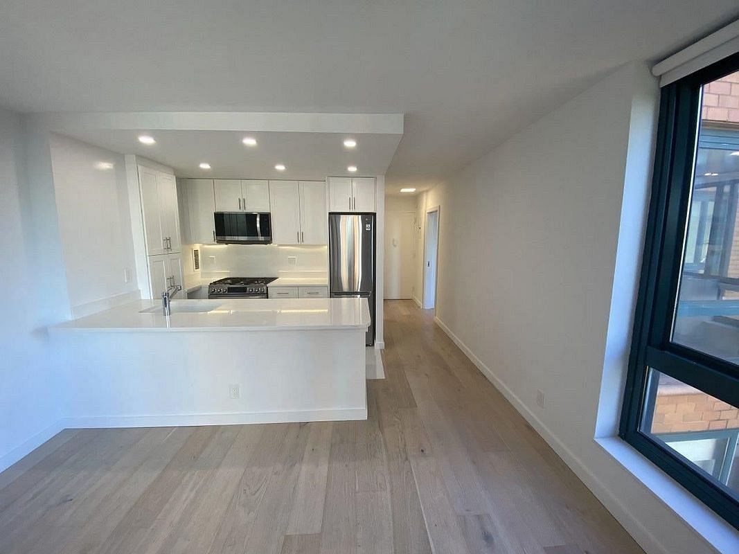 Bright and Open, West and North Views from this Modern and Light One Bedroom Apartment; Open Enlarged Kitchen with Breakfast Bar, Full Height Pantry, Brand New Stainless Steel Kitchen Appliances: Gas Range, Built-In Microwave, Dishwasher and Full Height Refrigerator/Freezer with Ice Maker; Spacious Living Area and Pocket Door Entry Bedroom, Newly Designed Closet Space (3 Closets), New Hardwood Floors, 2 Central HVAC Units, Oversize Thermopane Windows.