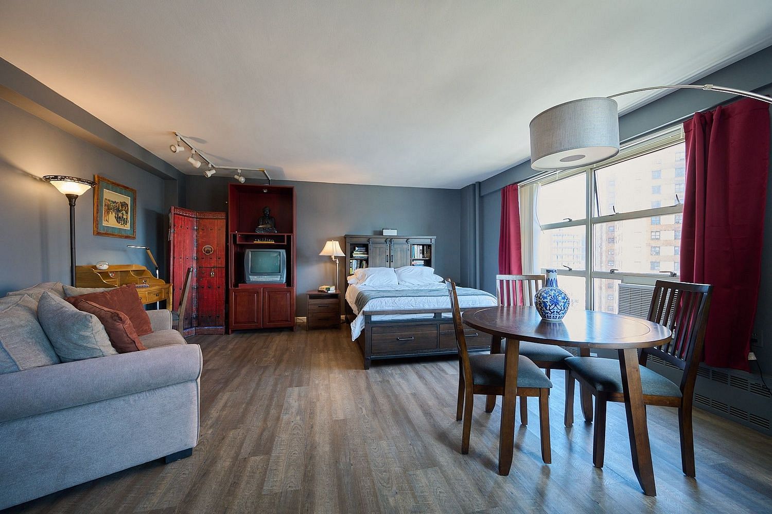 The windowed kitchen includes a pantry closet and an eat-at counter overlooking Amsterdam Avenue. The large open living area has plenty of room for dining, sleeping, entertaining — and studying.