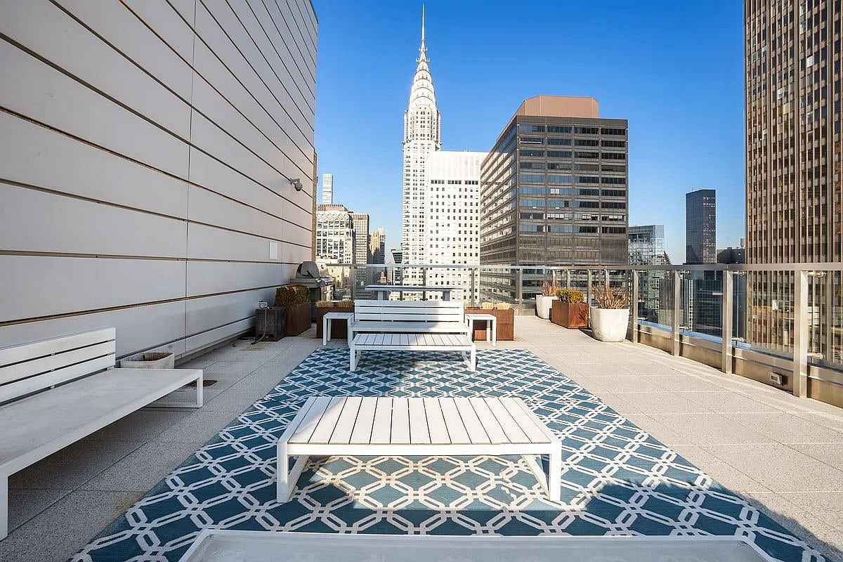 Scenic landscaped roof deck with BBQ stations and panoramic views of the Chrysler, Empire State, and East River