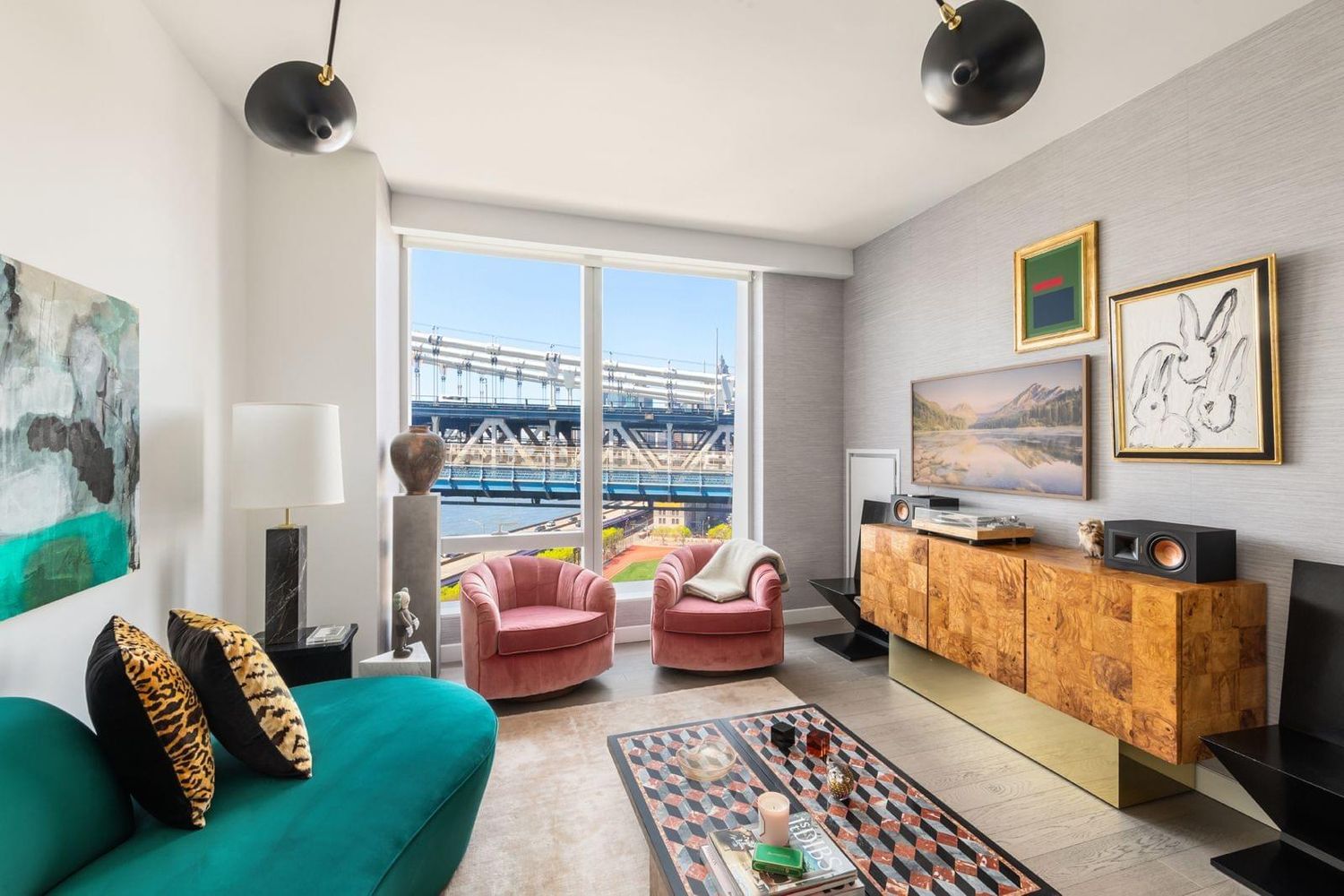 Moments from trendy dining, shopping, and nightlife in the Lower East Side, Chinatown, and Seaport District, this sun-splashed residence features beautiful stained oak floors, motorized shades, custom closets, and floor-to-ceiling windows with timeless views of the East River, Manhattan Bridge, and Lower Manhattan Skyline.