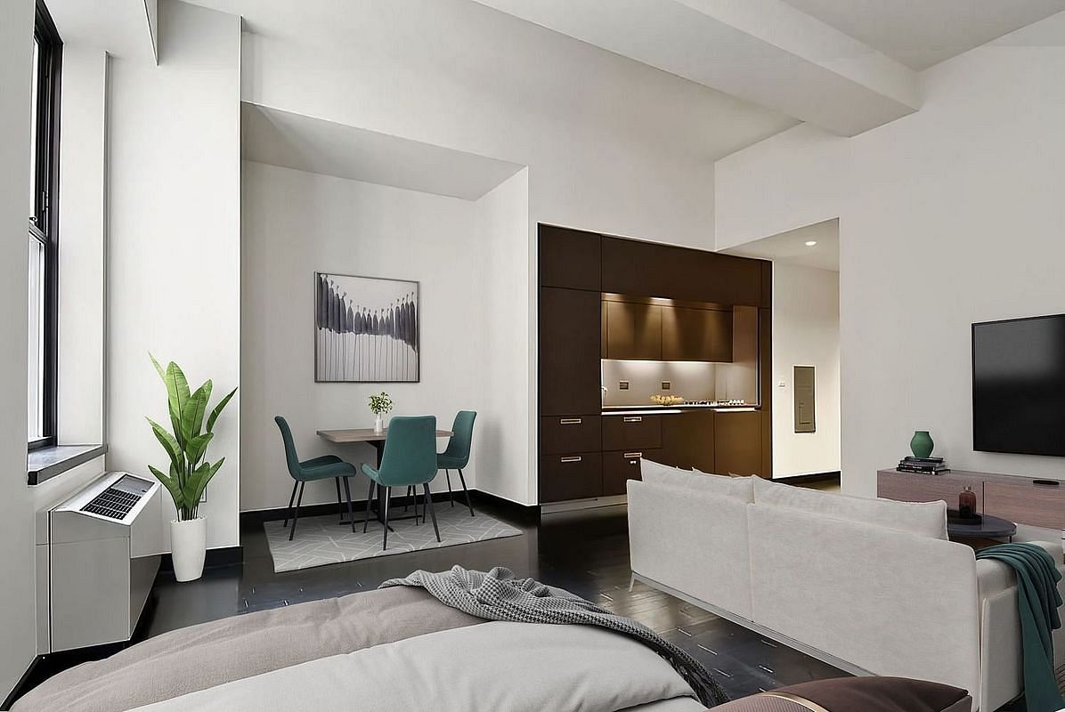 This home features an open-concept living area with abundant natural light, views of the New York Stock Exchange, high ceilings, and premium finishes. The modern kitchen boasts Miele and Sub- Zero appliances, a Washer/Dryer and ample cabinet space. The sleeping area offers a peaceful retreat, and the stylish bathroom includes contemporary fixtures and a deep soaking tub.